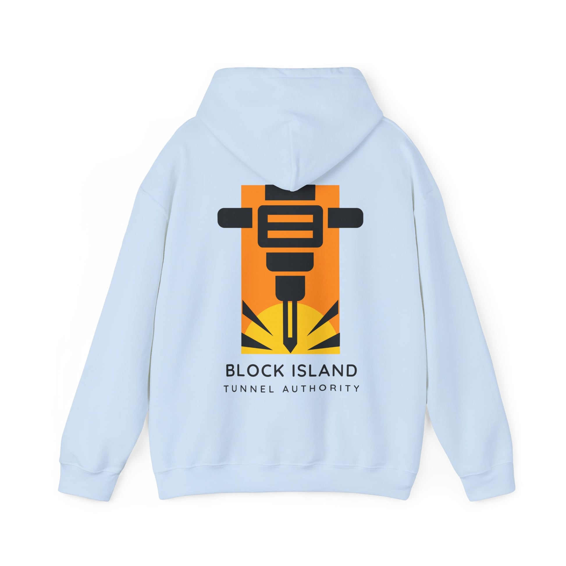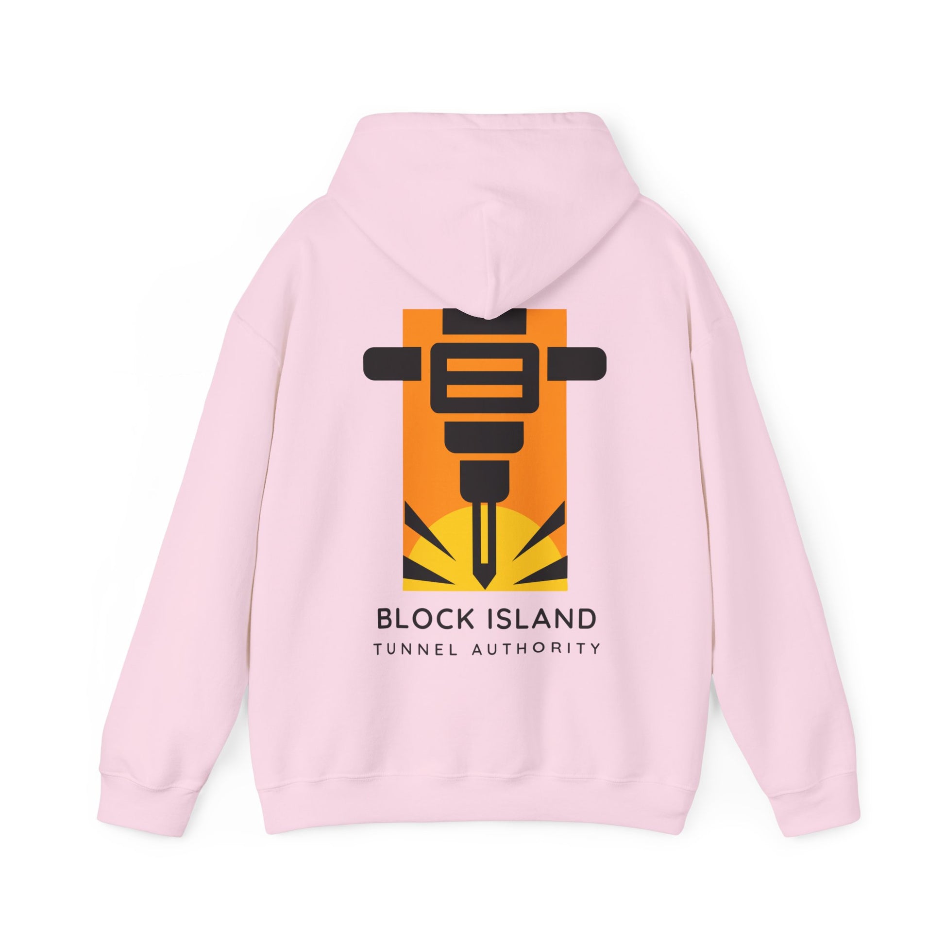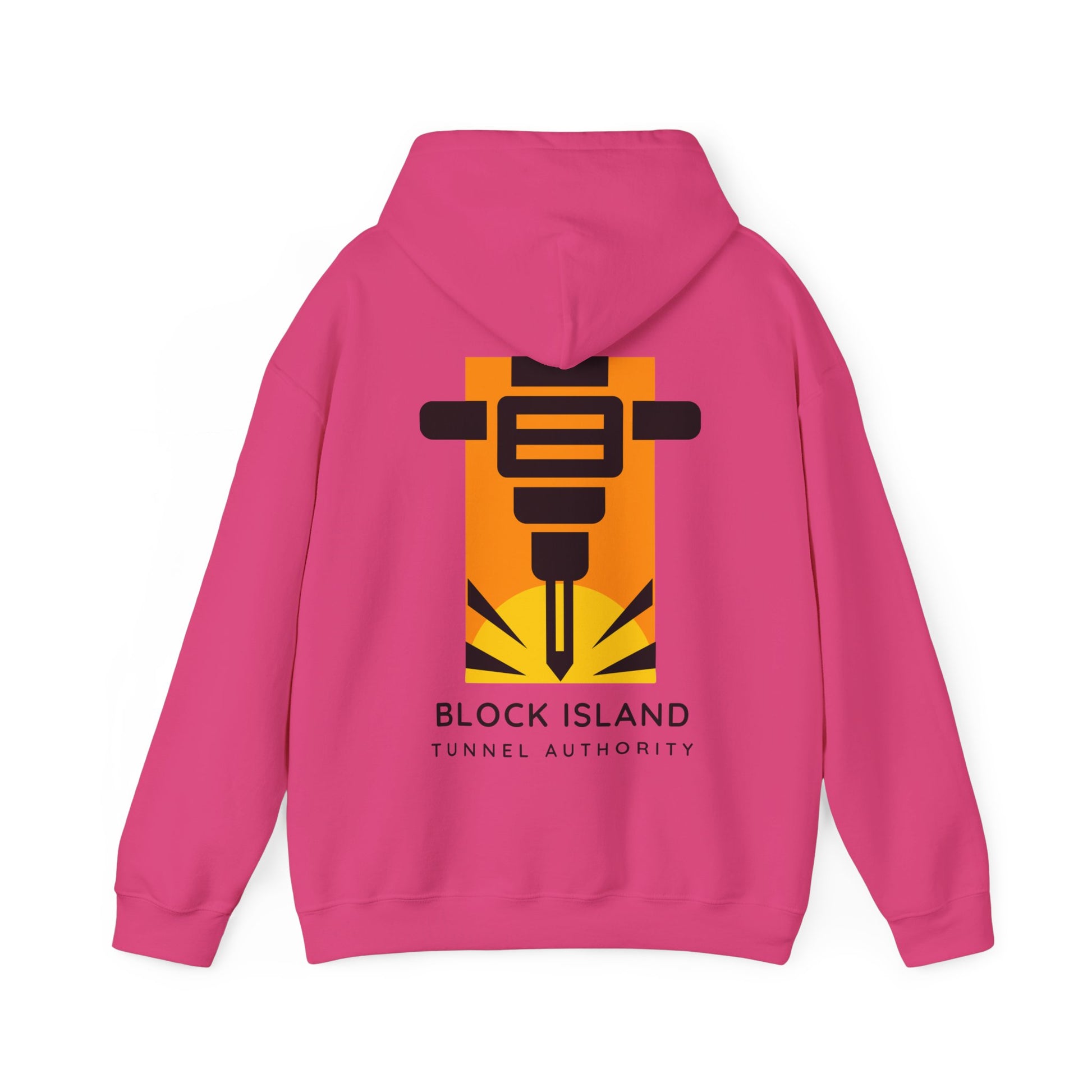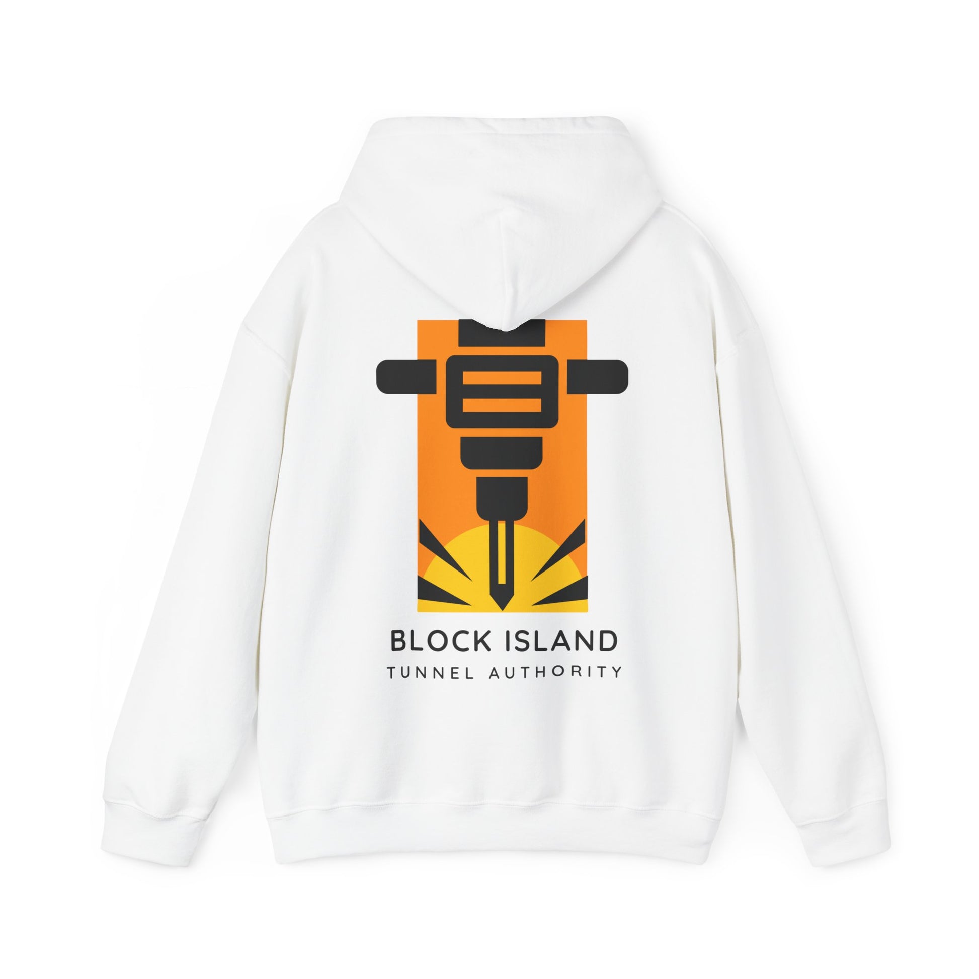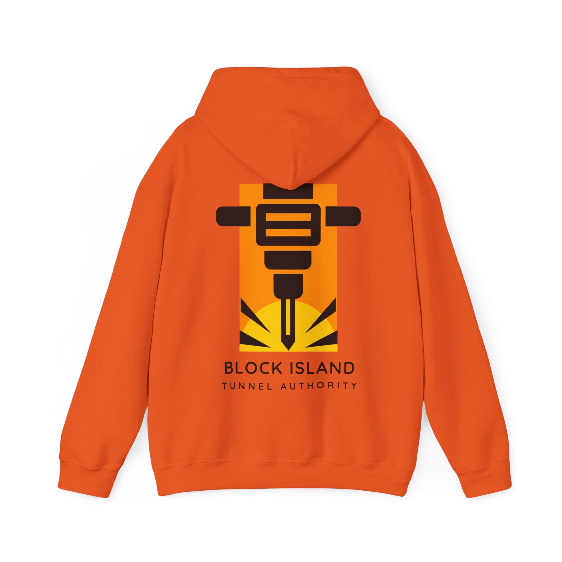 Stay stylish and warm with the Block Island Tunnel Authority Hammer Logo Hoodie, available in vibrant orange, bright yellow, and classic white colors. This hoodie features the same striking logo as the tee, with a small version on the front right chest and a large version on the back. The design of a jackhammer against a sunrise is both bold and eye-catching, making it the perfect choice for anyone looking to make a statement. The hoodie is made from high-quality materials that are soft and cozy, ensuring that you'll stay warm and comfortable no matter how chilly it gets. The Block Island Tunnel Authority Hammer Logo Hoodie is perfect for layering, whether you're heading out for a morning jog or simply running errands around town. With its unique design and comfortable fit, this hoodie is sure to become a staple in your wardrobe for years to come.