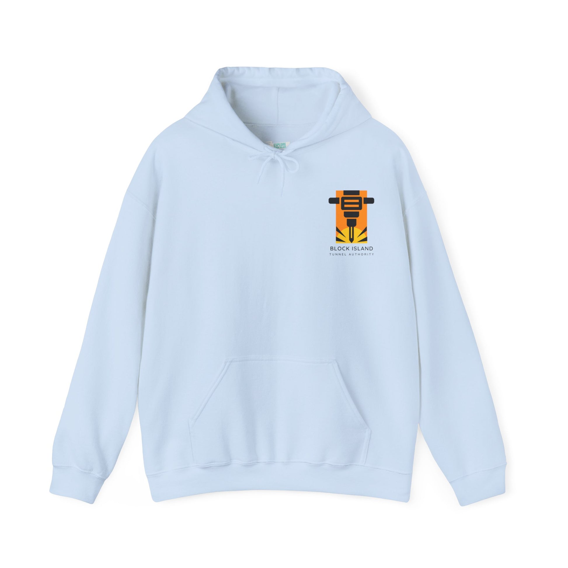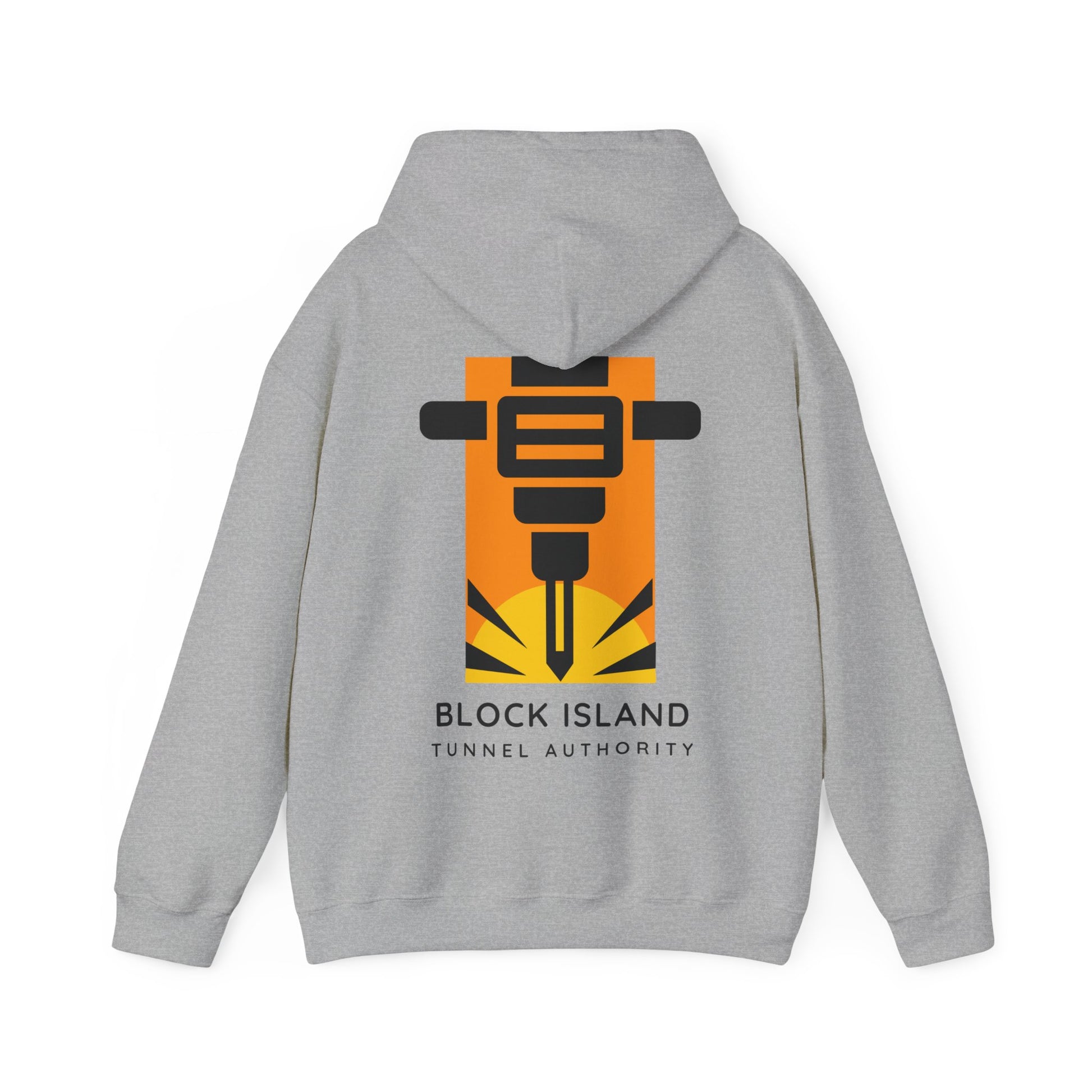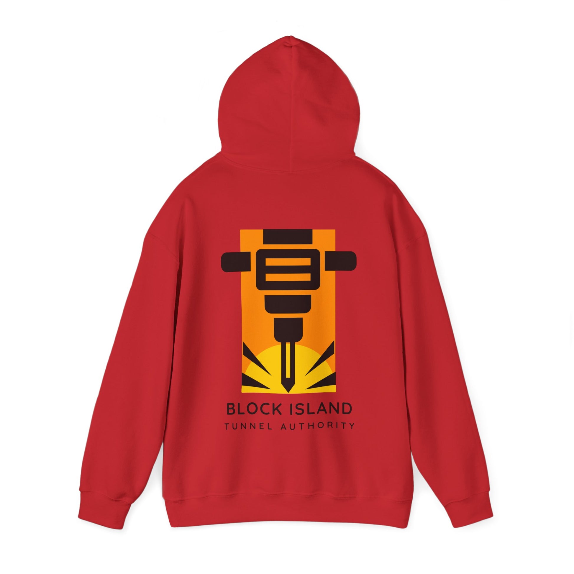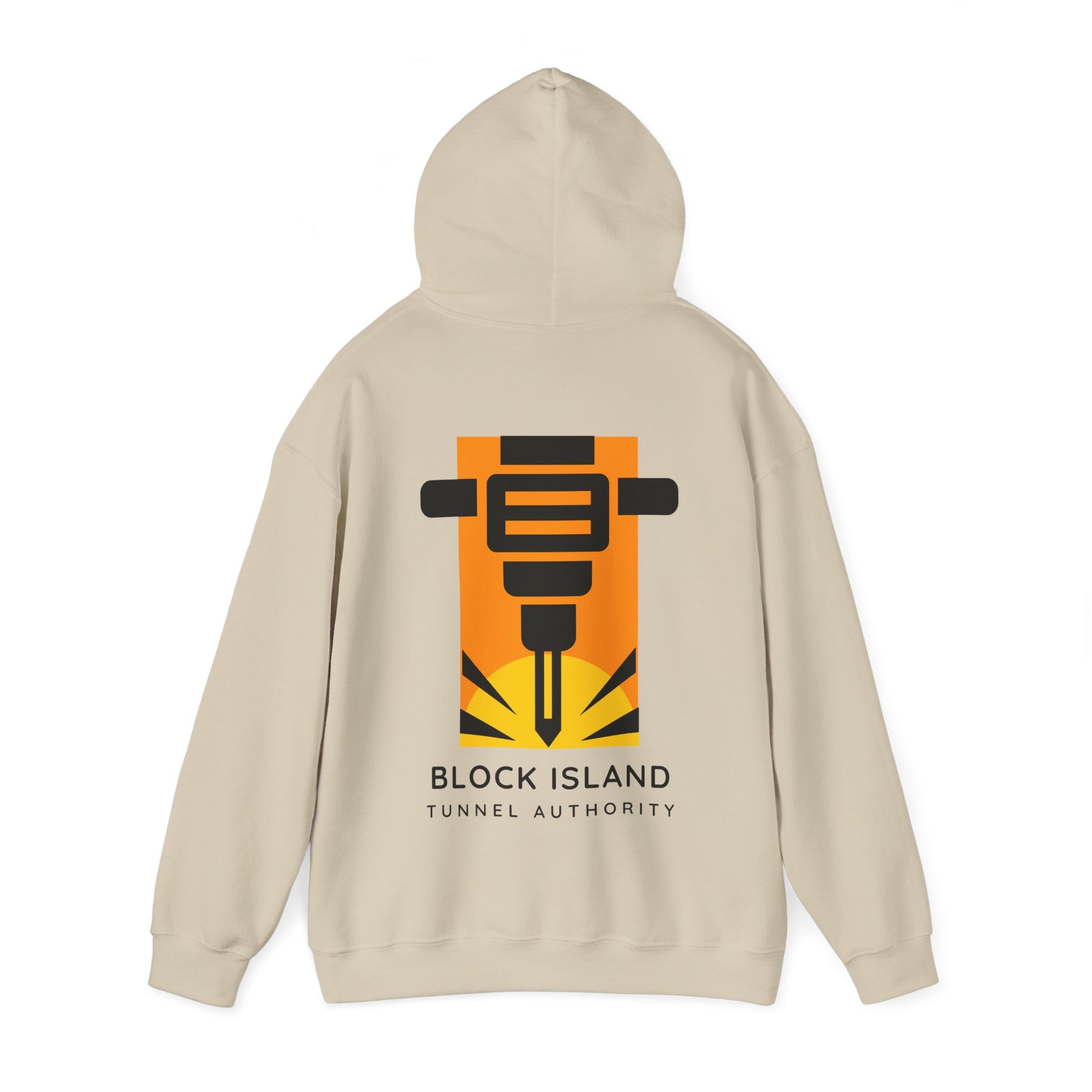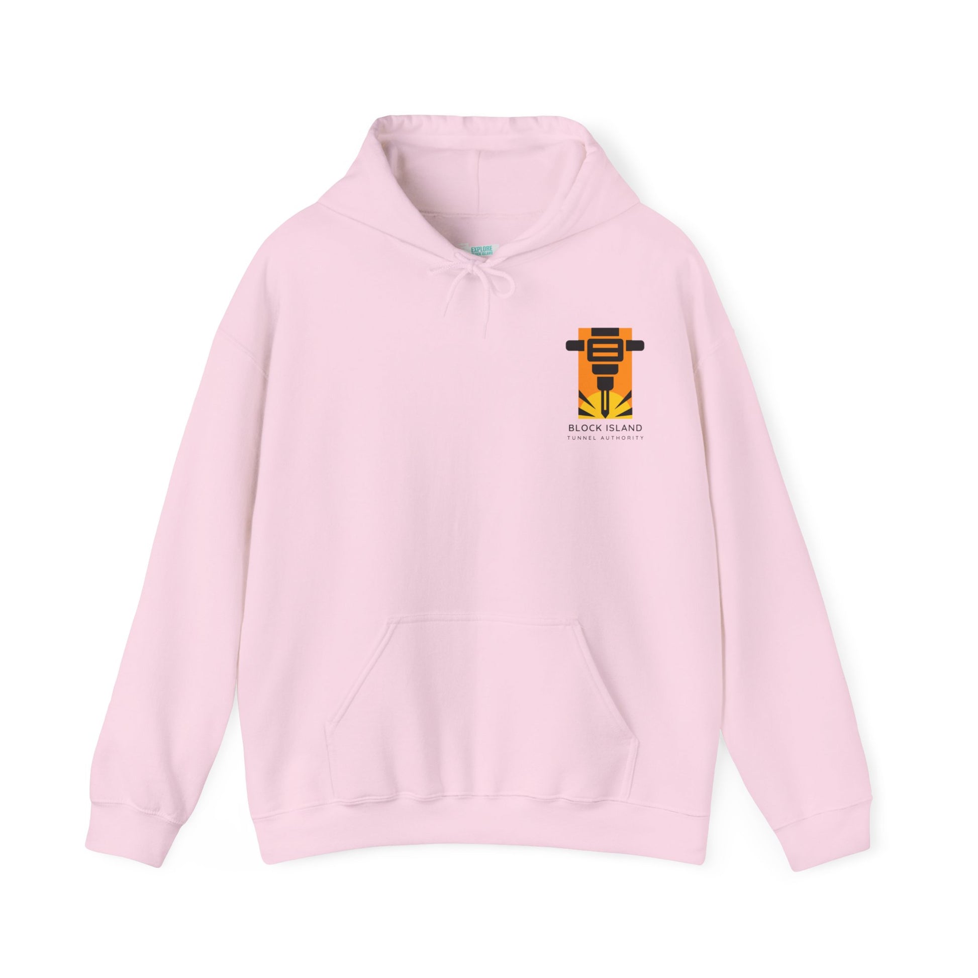 Stay stylish and warm with the Block Island Tunnel Authority Hammer Logo Hoodie, available in vibrant orange, bright yellow, and classic white colors. This hoodie features the same striking logo as the tee, with a small version on the front right chest and a large version on the back. The design of a jackhammer against a sunrise is both bold and eye-catching, making it the perfect choice for anyone looking to make a statement. The hoodie is made from high-quality materials that are soft and cozy, ensuring that you'll stay warm and comfortable no matter how chilly it gets. The Block Island Tunnel Authority Hammer Logo Hoodie is perfect for layering, whether you're heading out for a morning jog or simply running errands around town. With its unique design and comfortable fit, this hoodie is sure to become a staple in your wardrobe for years to come.