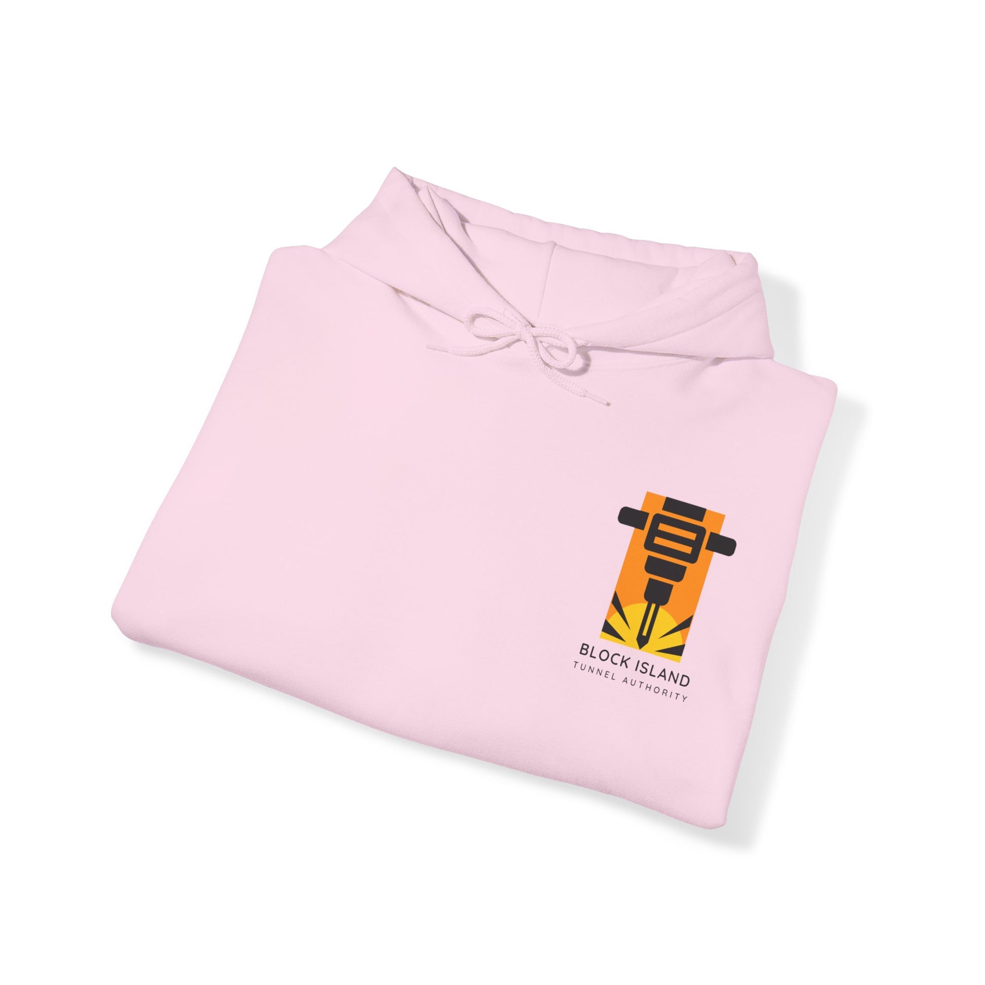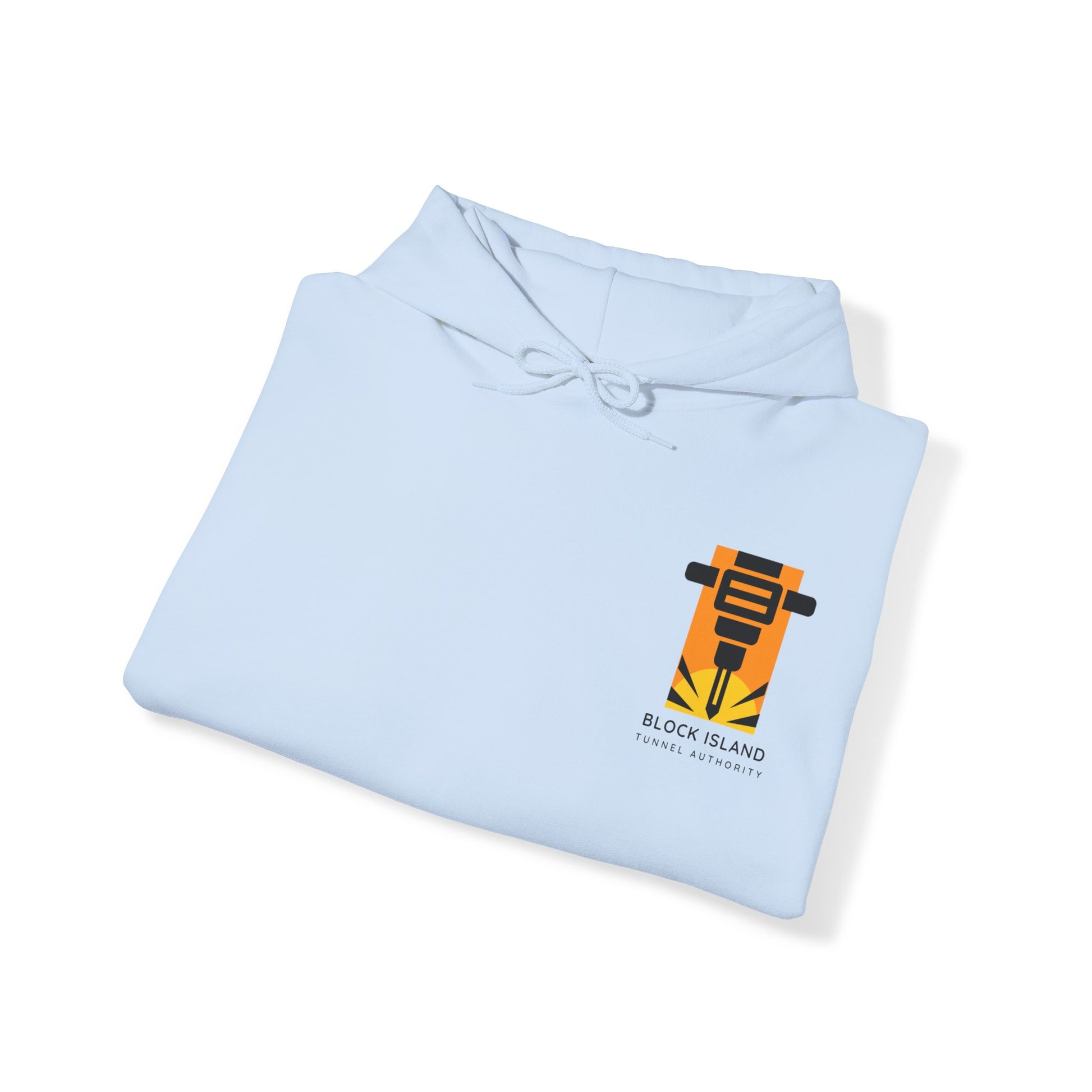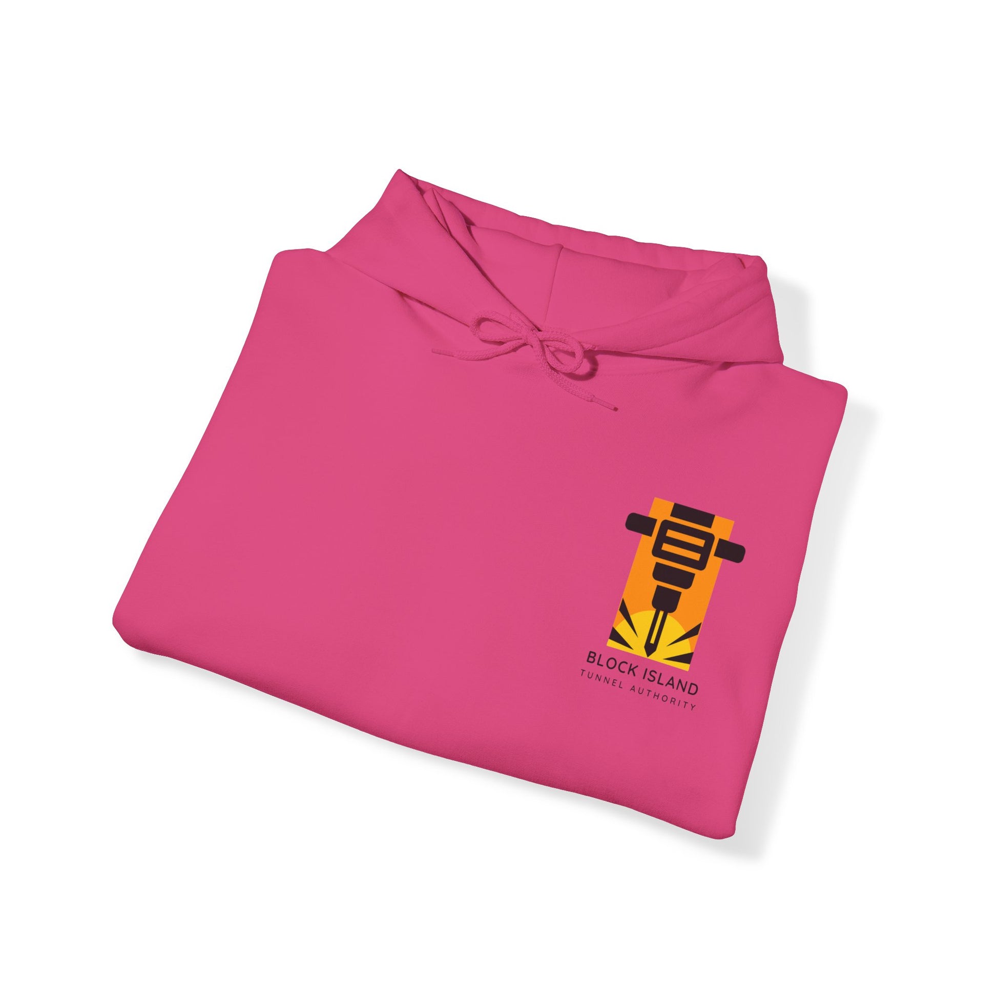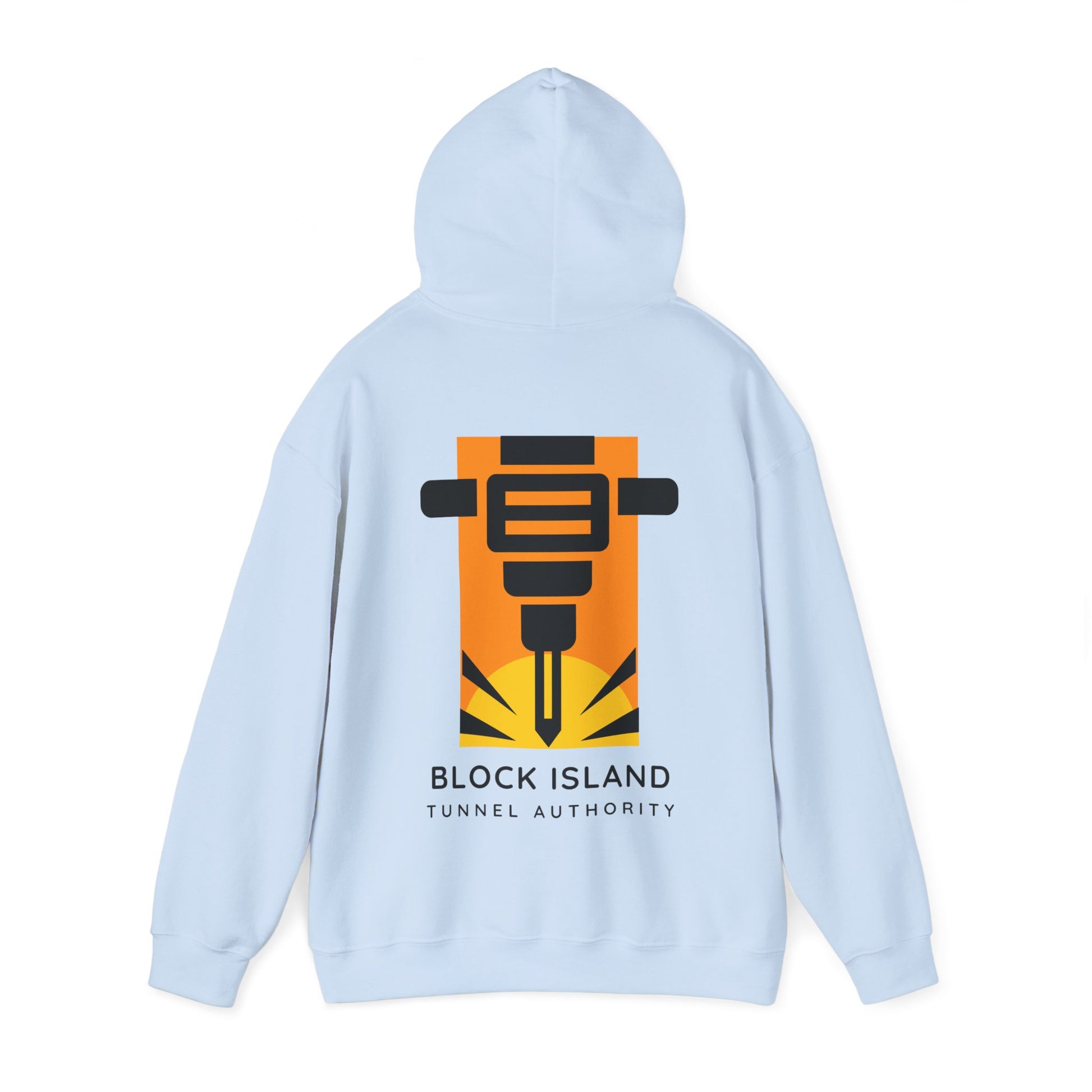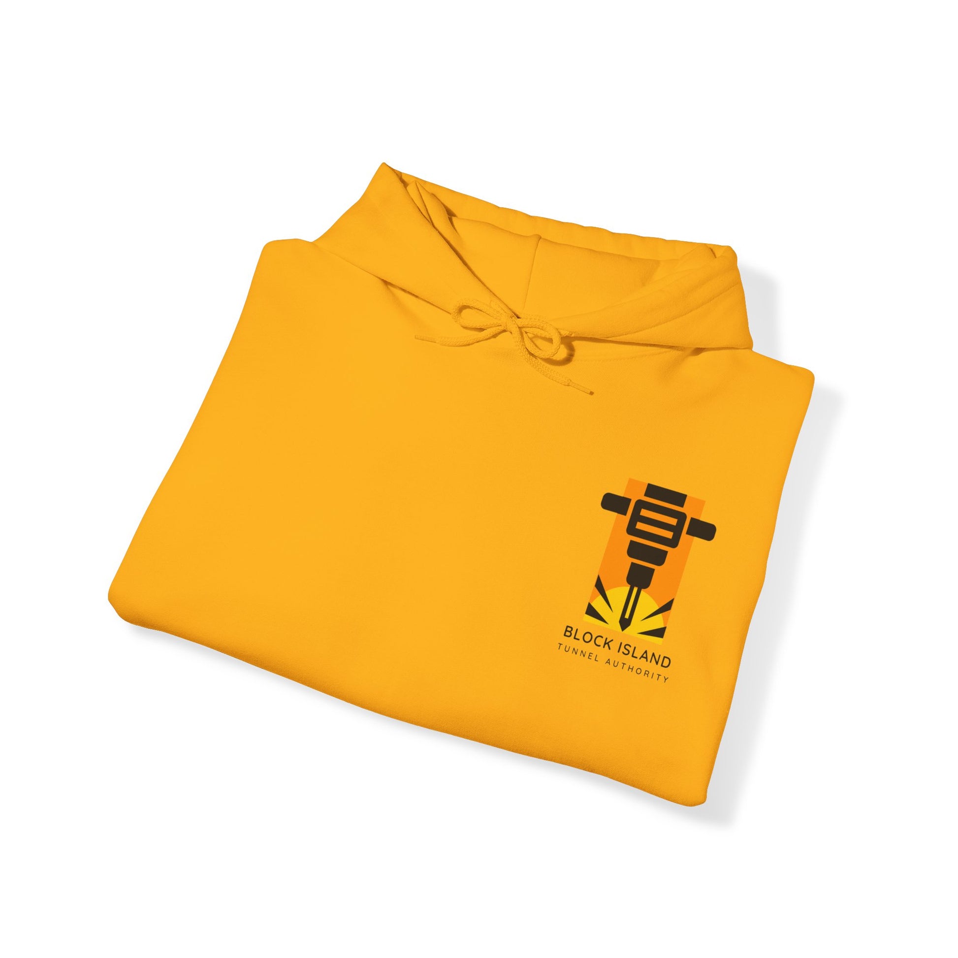 Stay stylish and warm with the Block Island Tunnel Authority Hammer Logo Hoodie, available in vibrant orange, bright yellow, and classic white colors. This hoodie features the same striking logo as the tee, with a small version on the front right chest and a large version on the back. The design of a jackhammer against a sunrise is both bold and eye-catching, making it the perfect choice for anyone looking to make a statement. The hoodie is made from high-quality materials that are soft and cozy, ensuring that you'll stay warm and comfortable no matter how chilly it gets. The Block Island Tunnel Authority Hammer Logo Hoodie is perfect for layering, whether you're heading out for a morning jog or simply running errands around town. With its unique design and comfortable fit, this hoodie is sure to become a staple in your wardrobe for years to come.