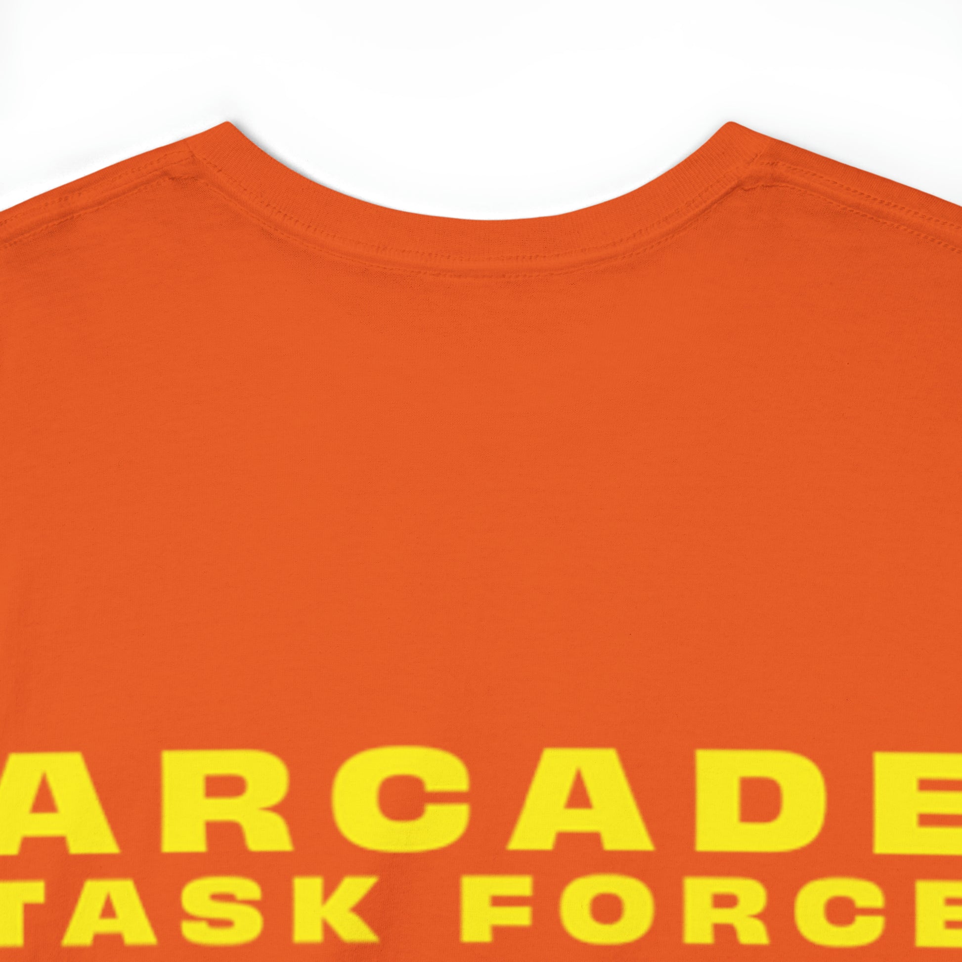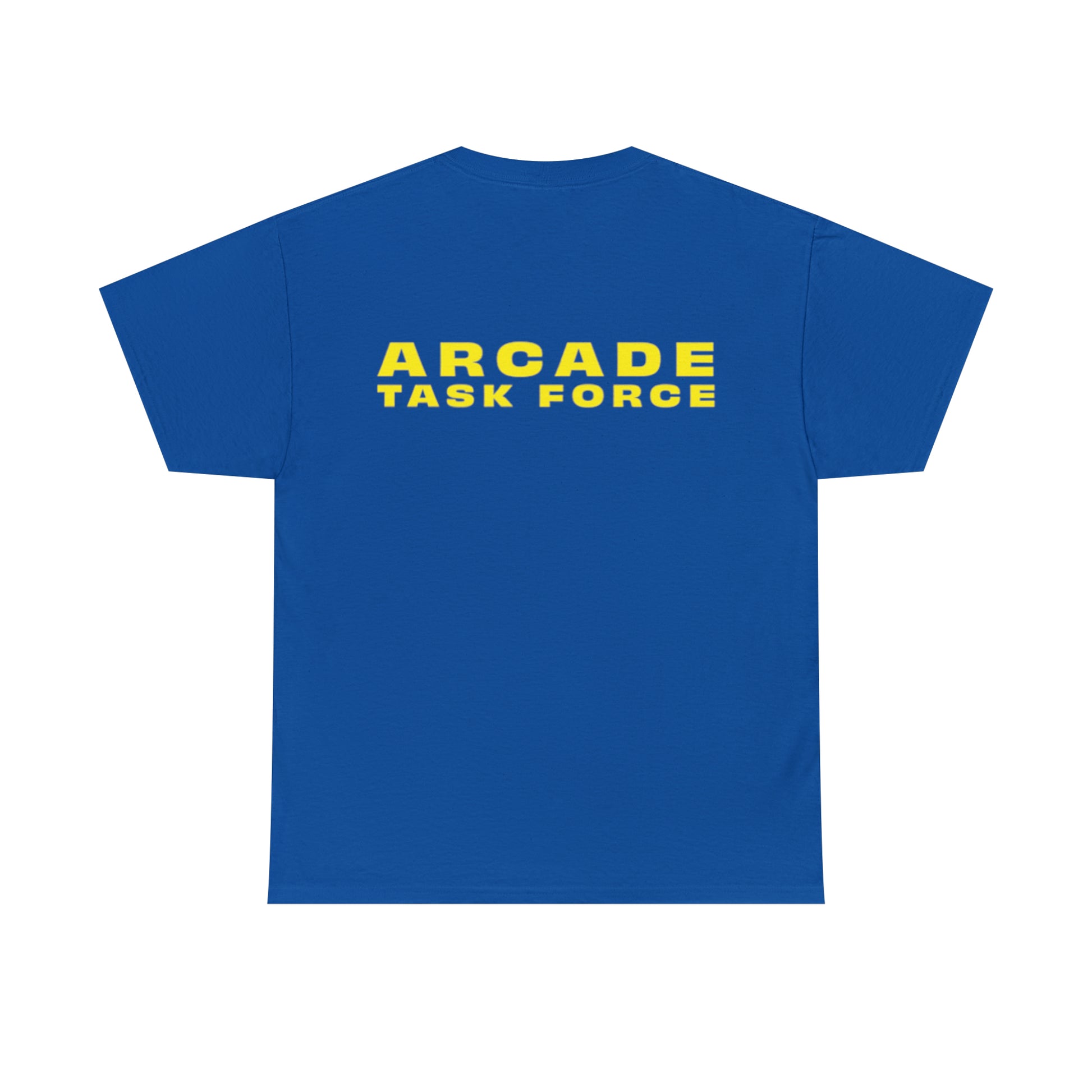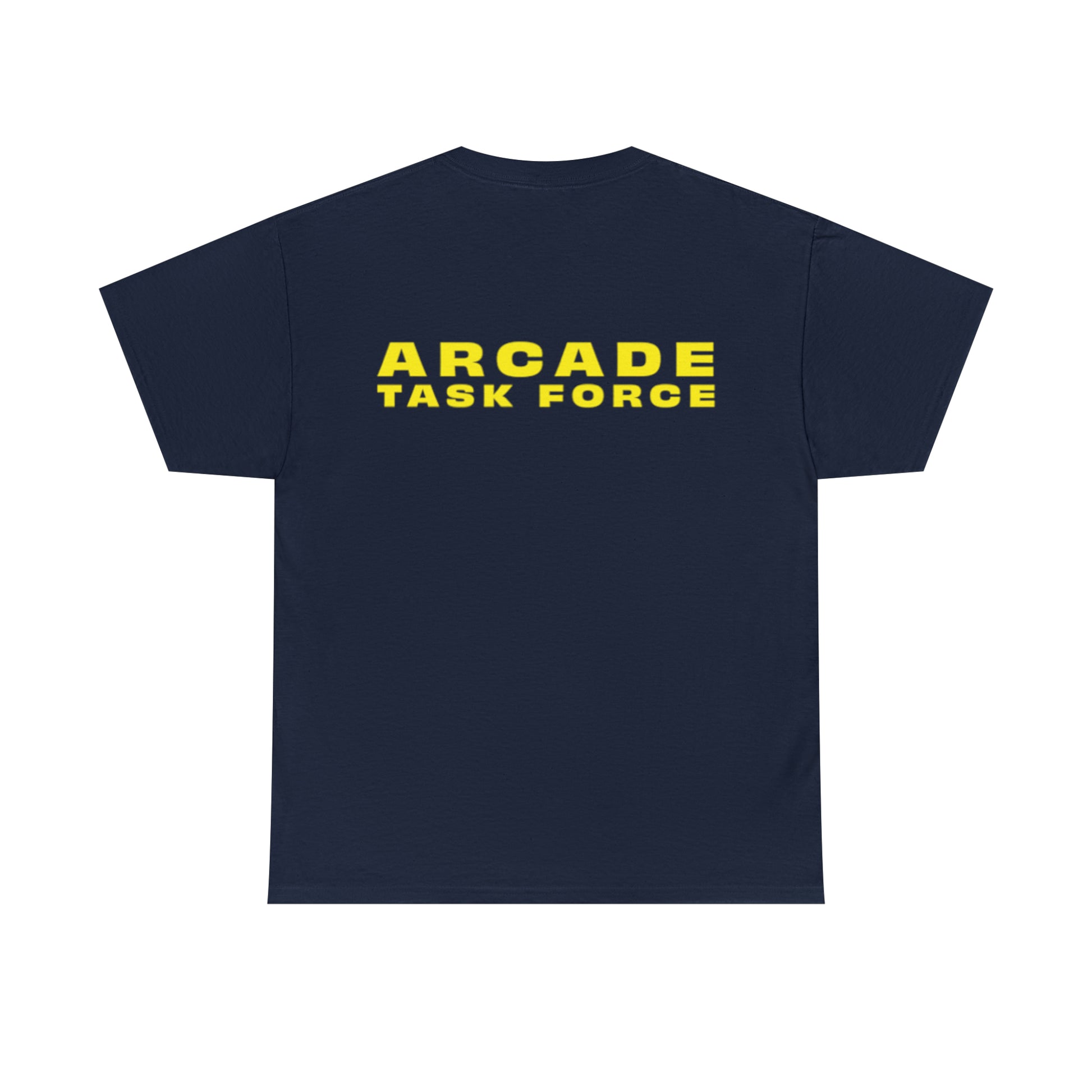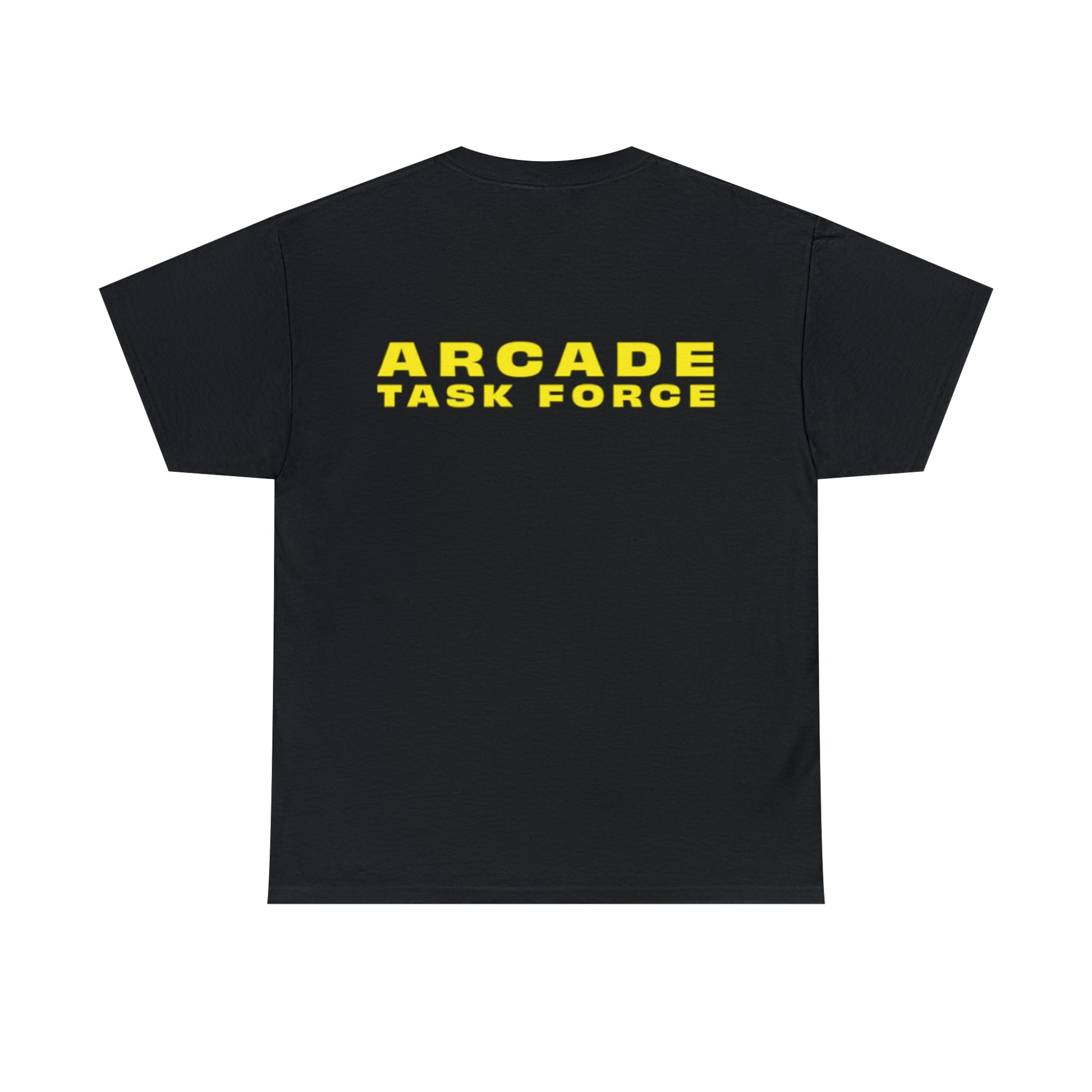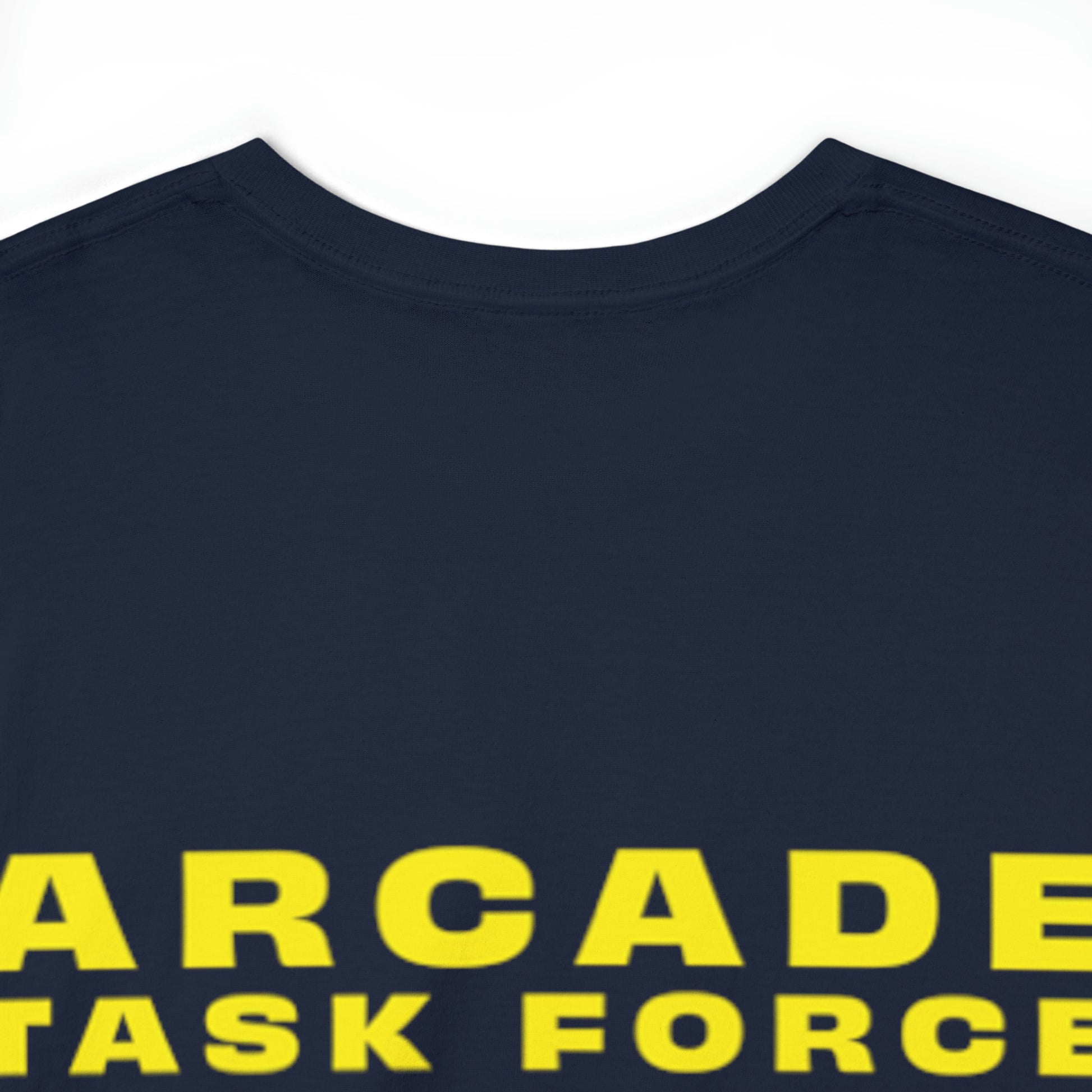 Turn to the back of the tee, and you will find the inscription "Arcade Task Force." This haunting phrase encapsulates the primary objective of the Block Island Gaming Police: to locate and dismantle gaming establishments, erasing the once-vibrant laughter and enjoyment that once filled these spaces. As you wear this tee, you become a bearer of a narrative that questions the extent of control exerted over personal freedoms and the right to engage in innocent amusement.