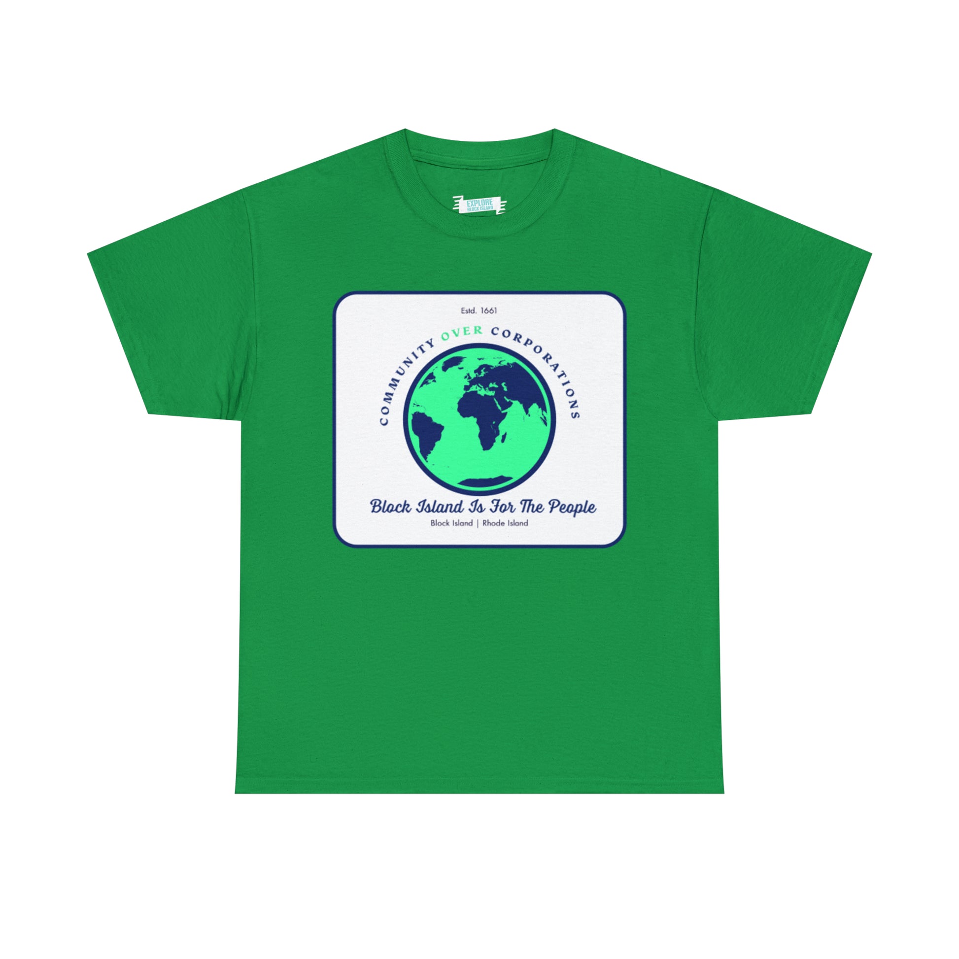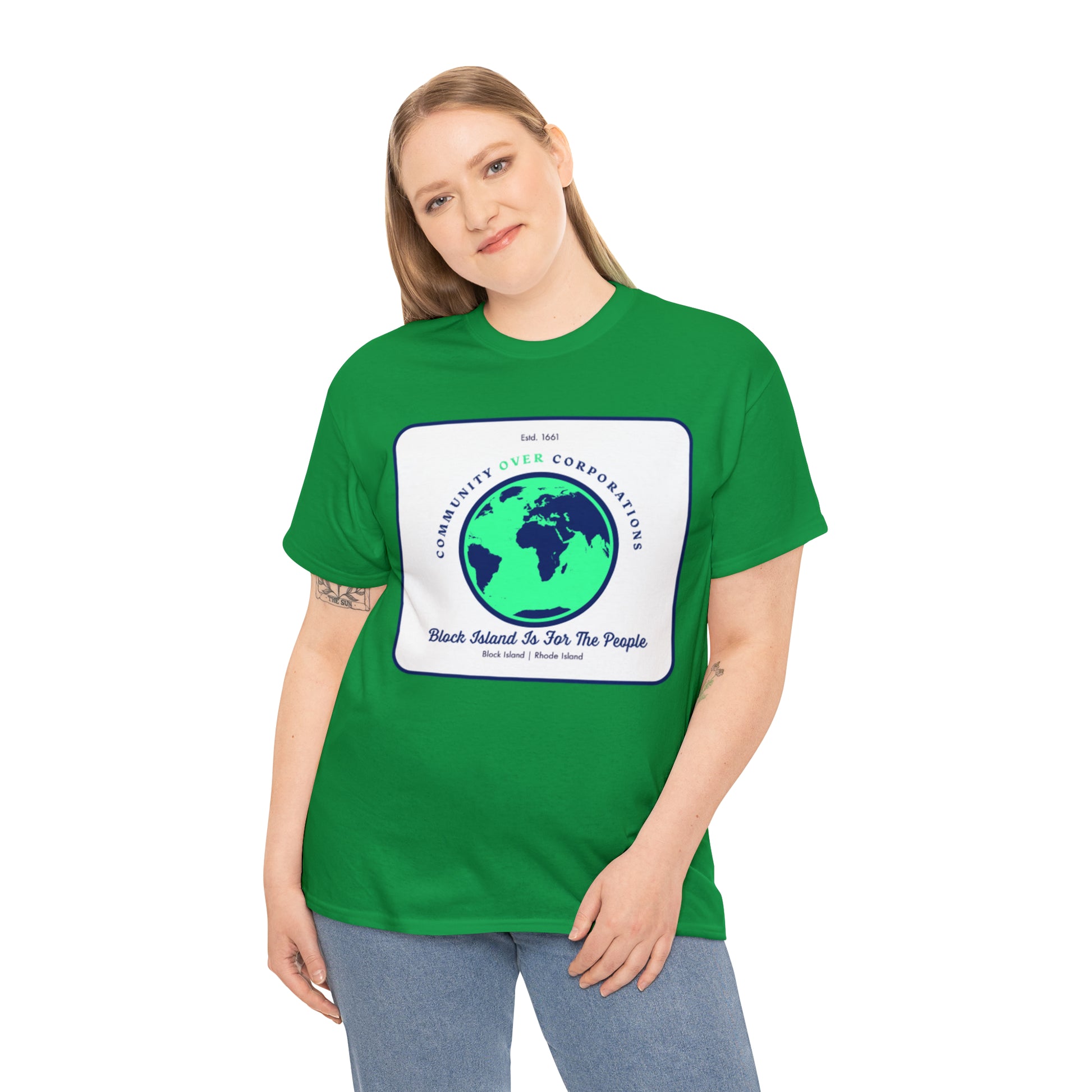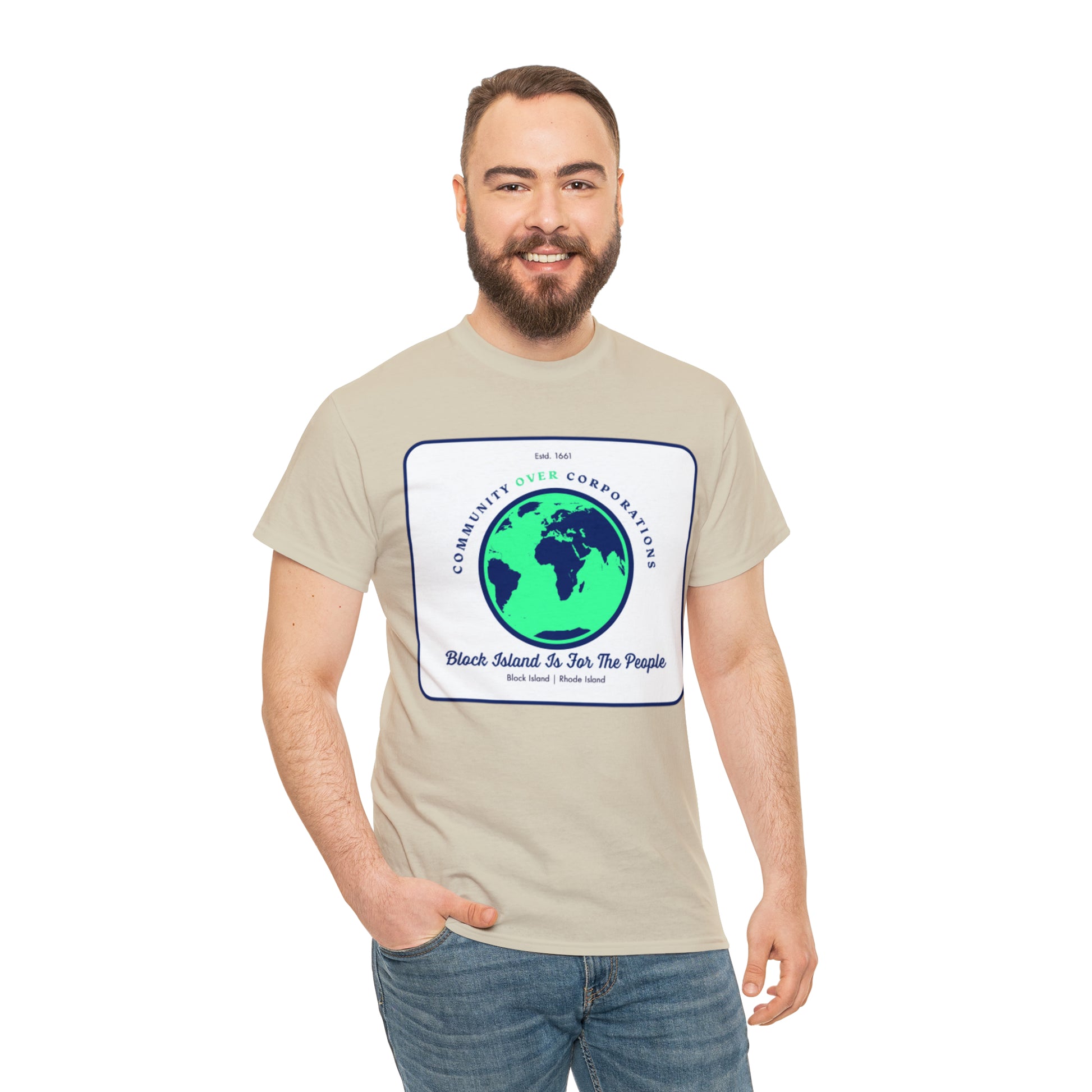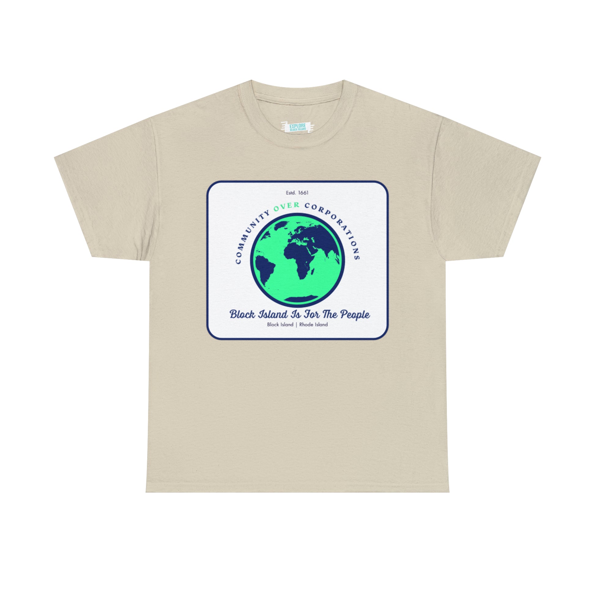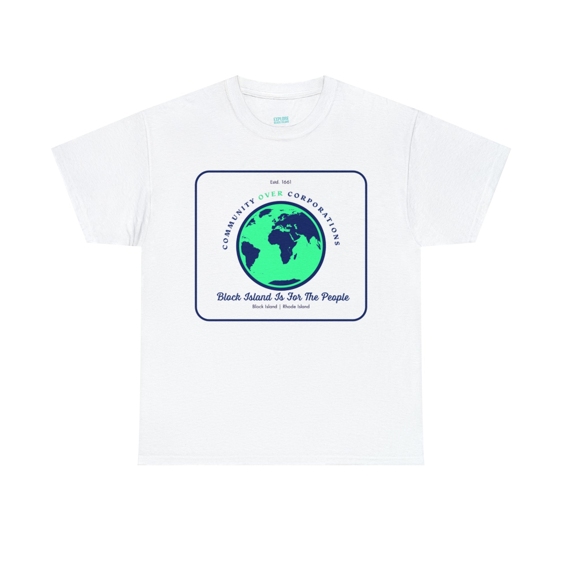 Wear the Community Over Corporations Tee proudly, embodying the spirit of Block Island's resilient community and sending a powerful message that together, we prioritize the well-being and empowerment of individuals over corporate interests.