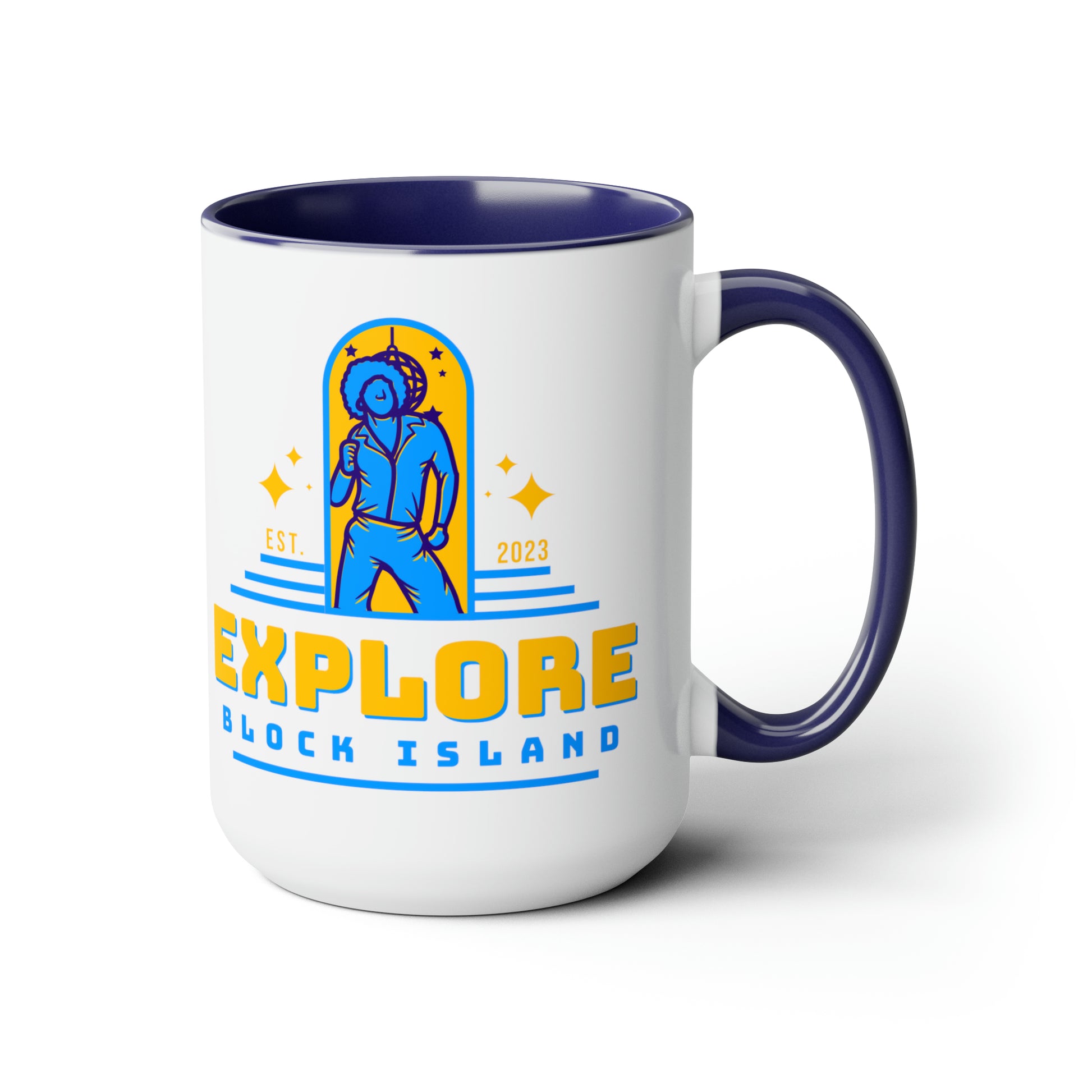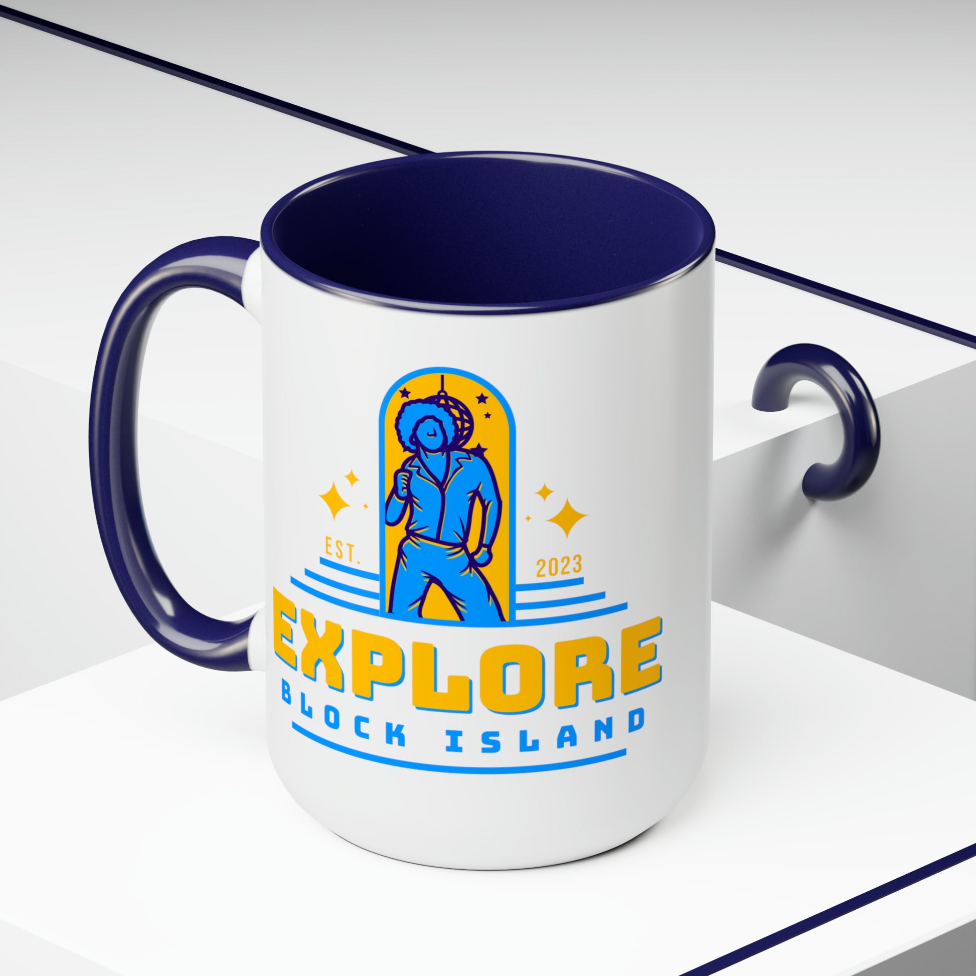 Introducing the Explore Block Island Mug with the Dancing Man Logo: Your Gateway to Island Adventures