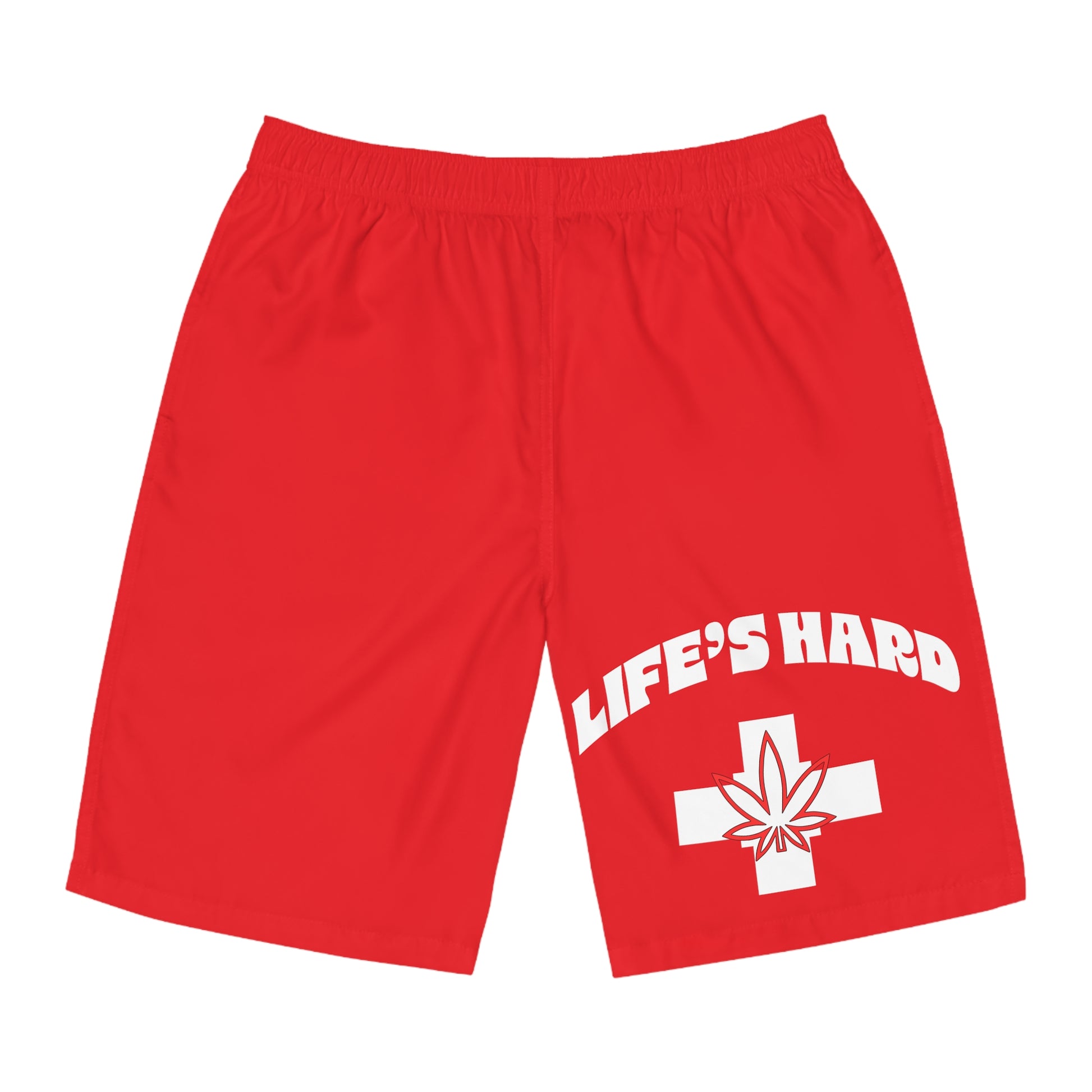 Introducing Life's Hard Board Shorts, a bold and expressive choice for those who embrace a laid-back lifestyle and enjoy their time on the beach. These vibrant red board shorts feature a unique design on the left front leg that captures the essence of relaxation and a touch of irreverence.