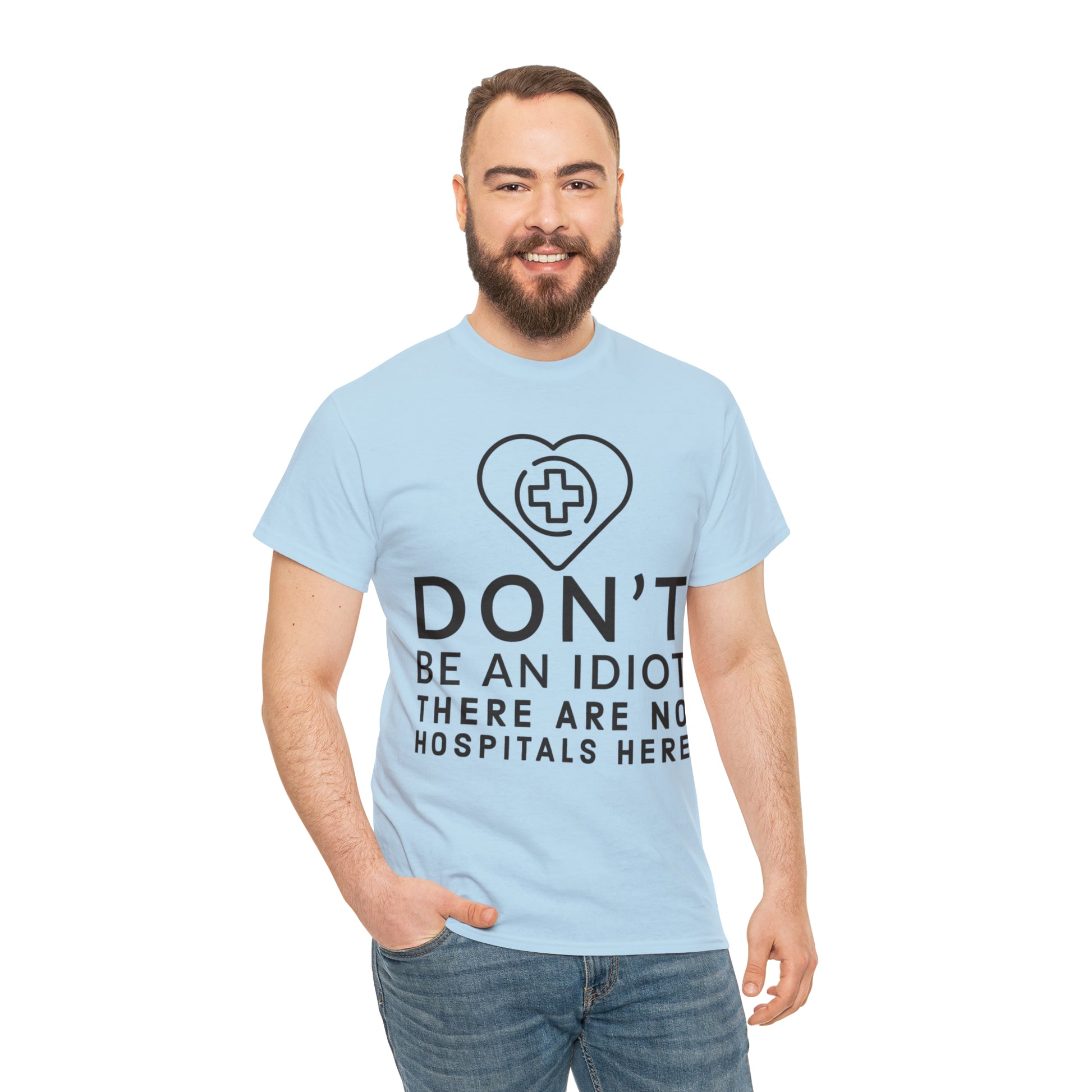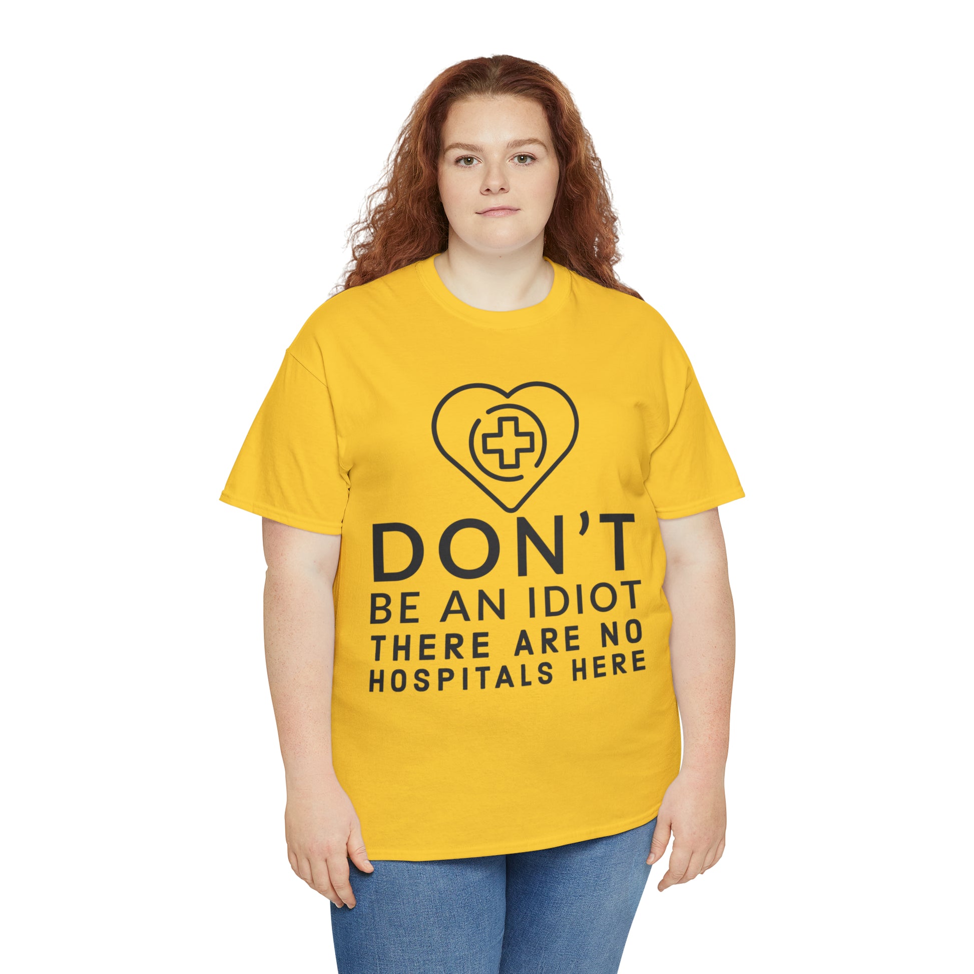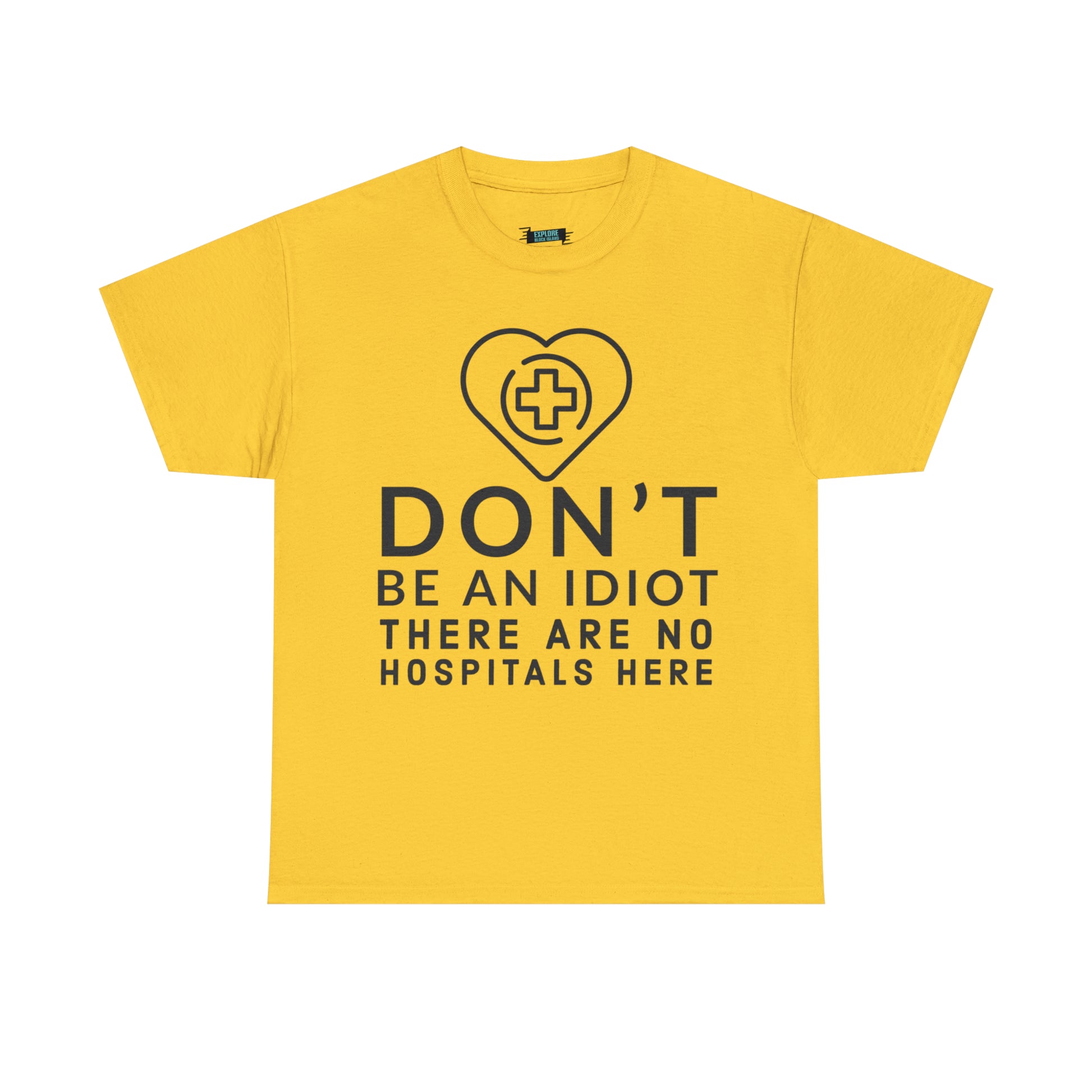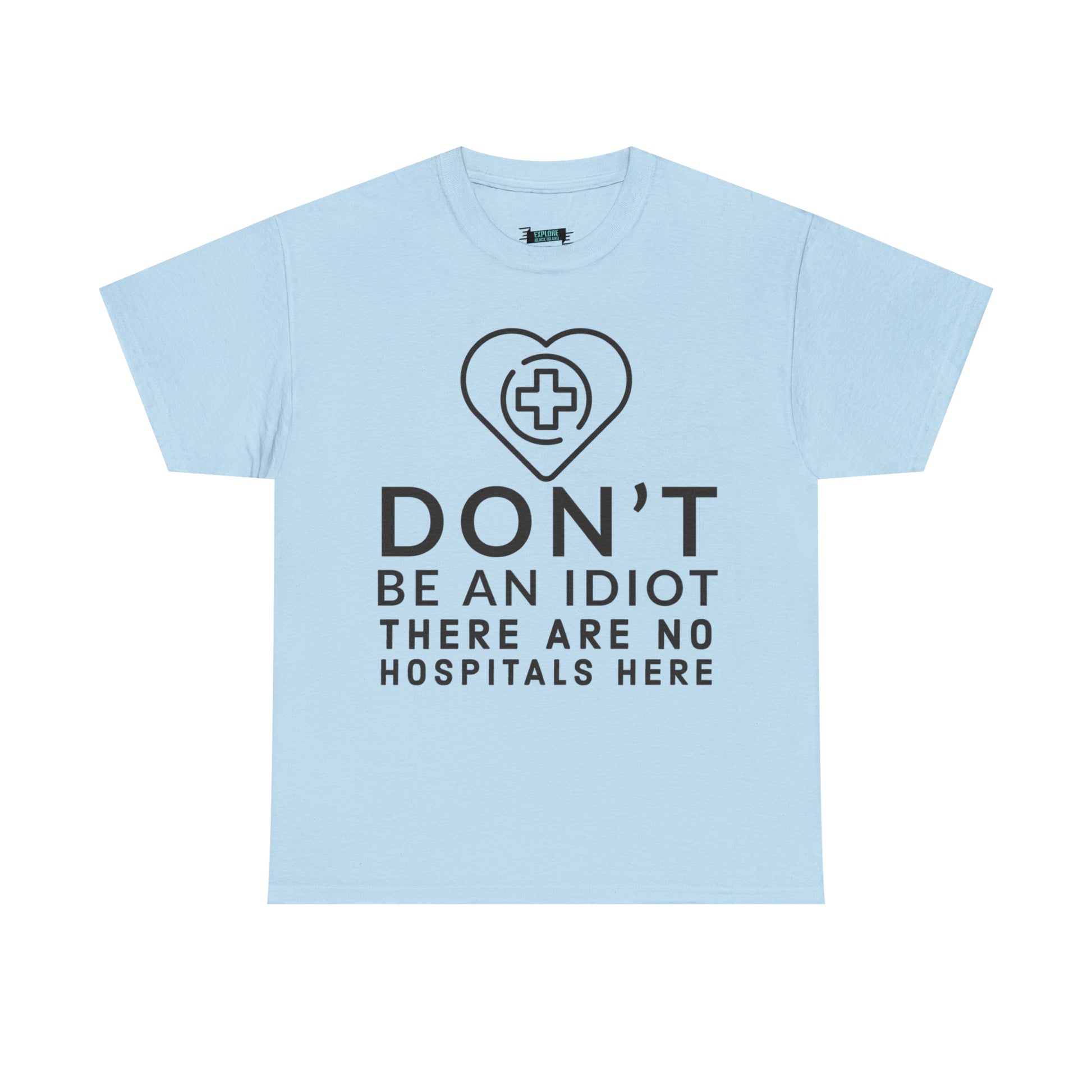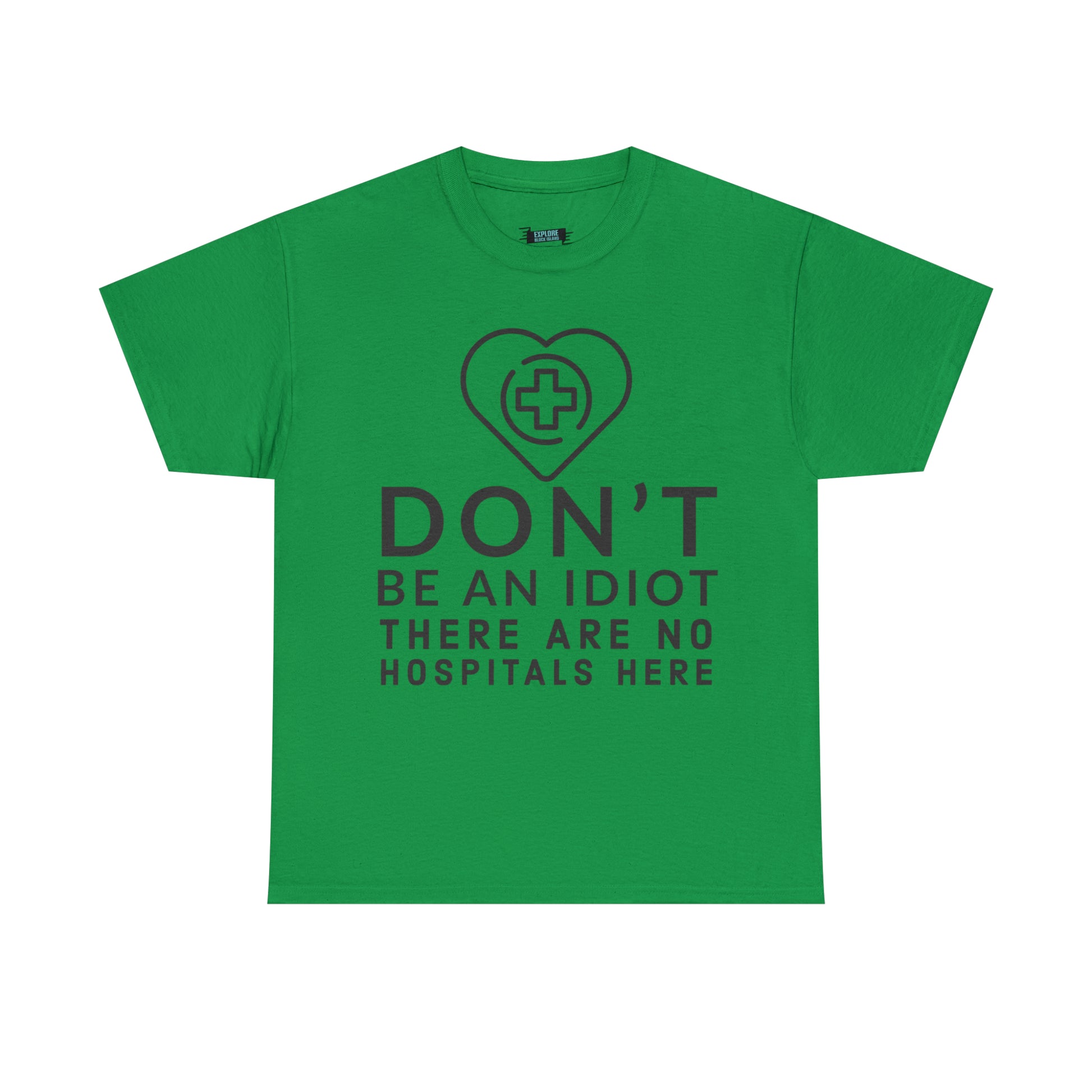At the center of the tee is a heart symbol with a medical plus sign inside, representing the importance of health and well-being. Underneath the symbol, bold lettering states, "Don't Be An Idiot, There Are No Hospitals Here," delivering a straightforward message that resonates with the island's reality.