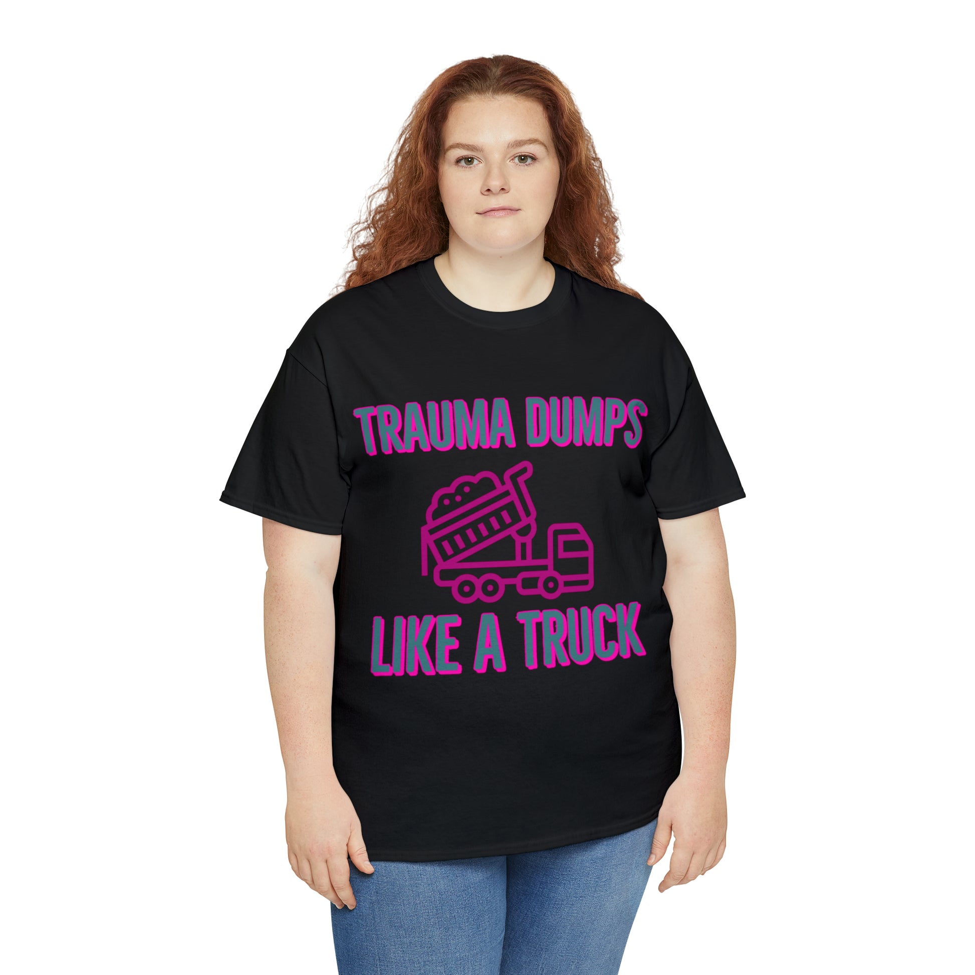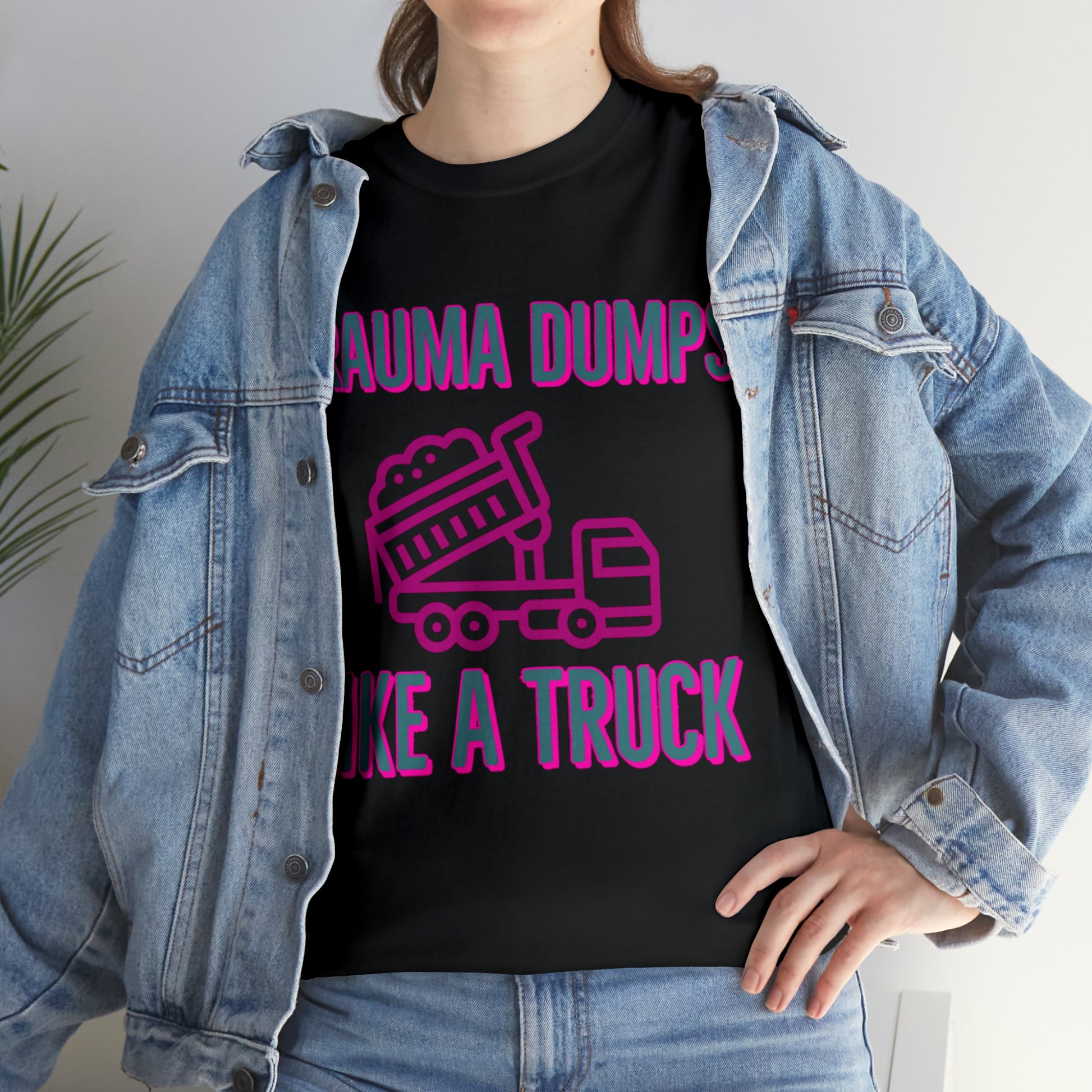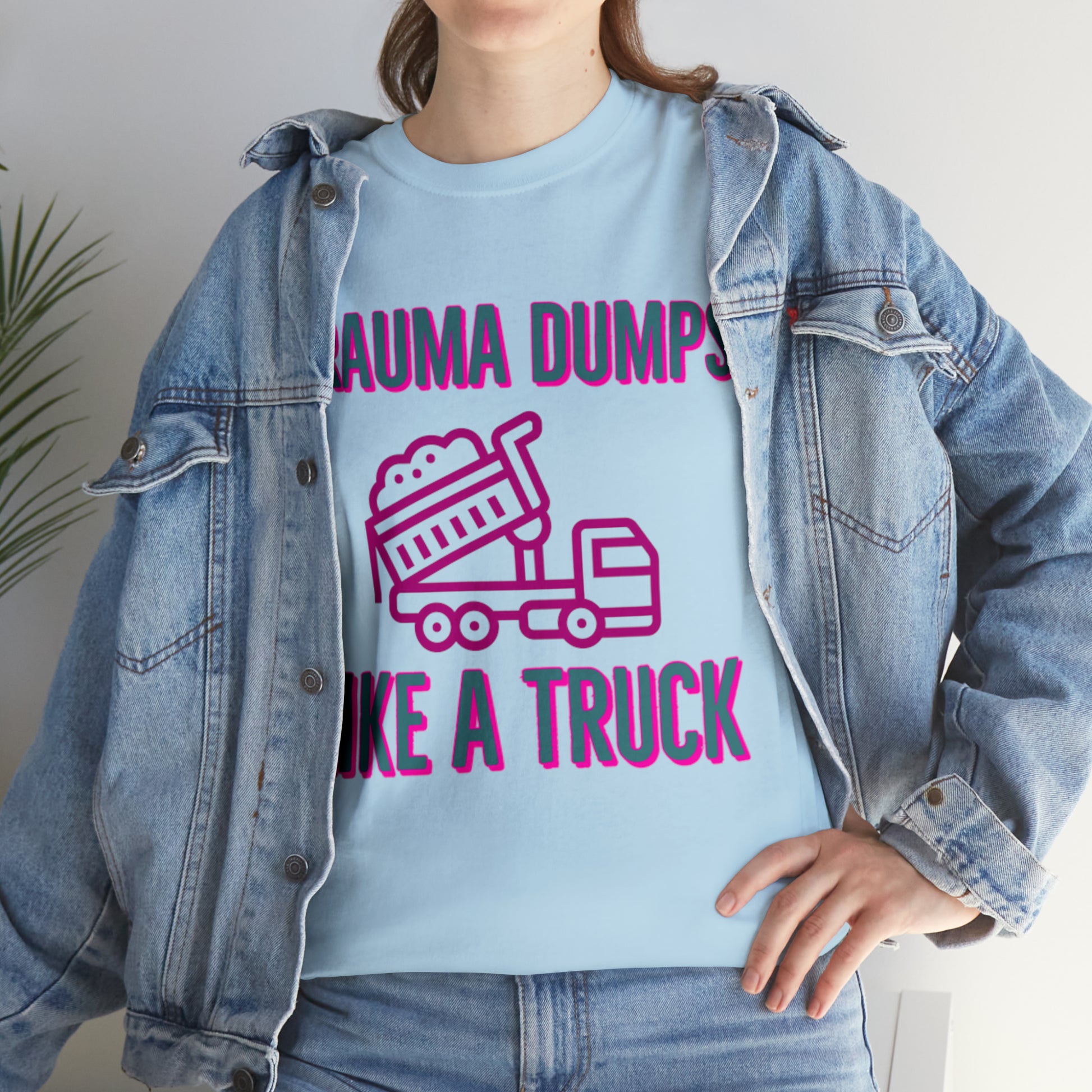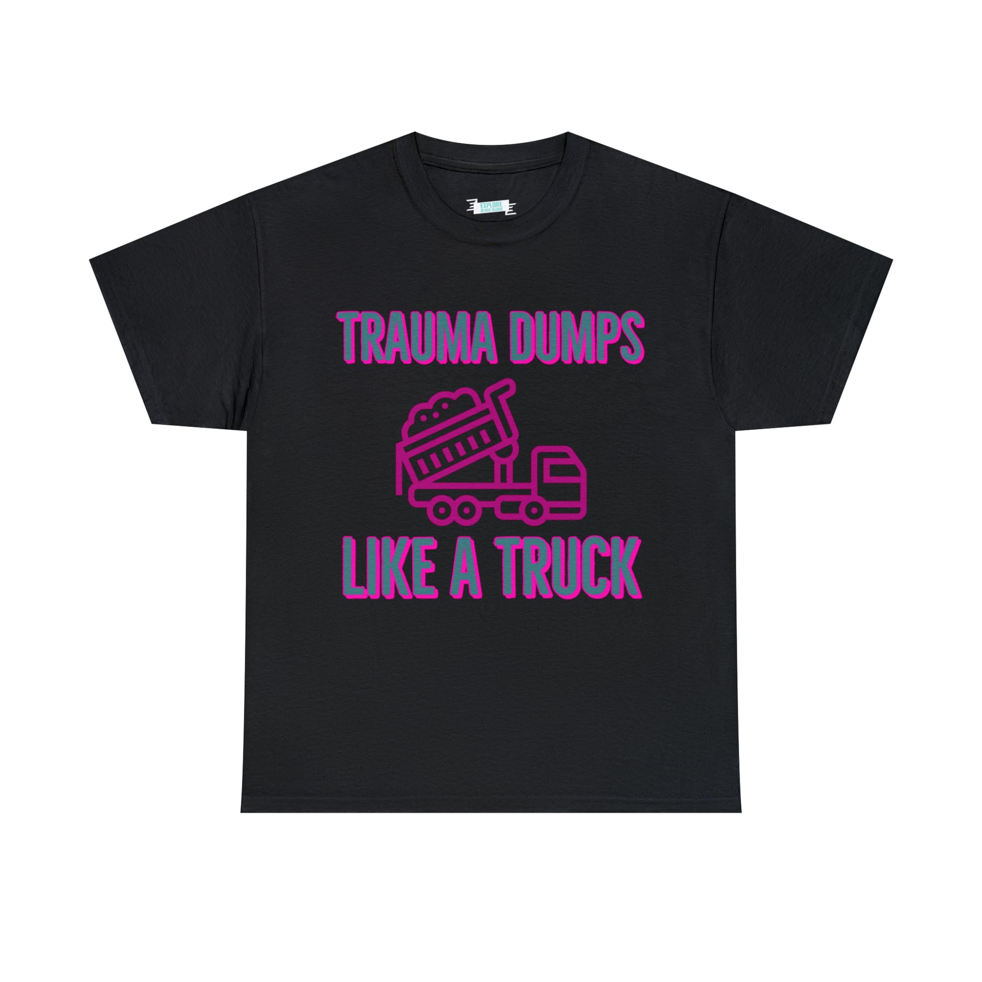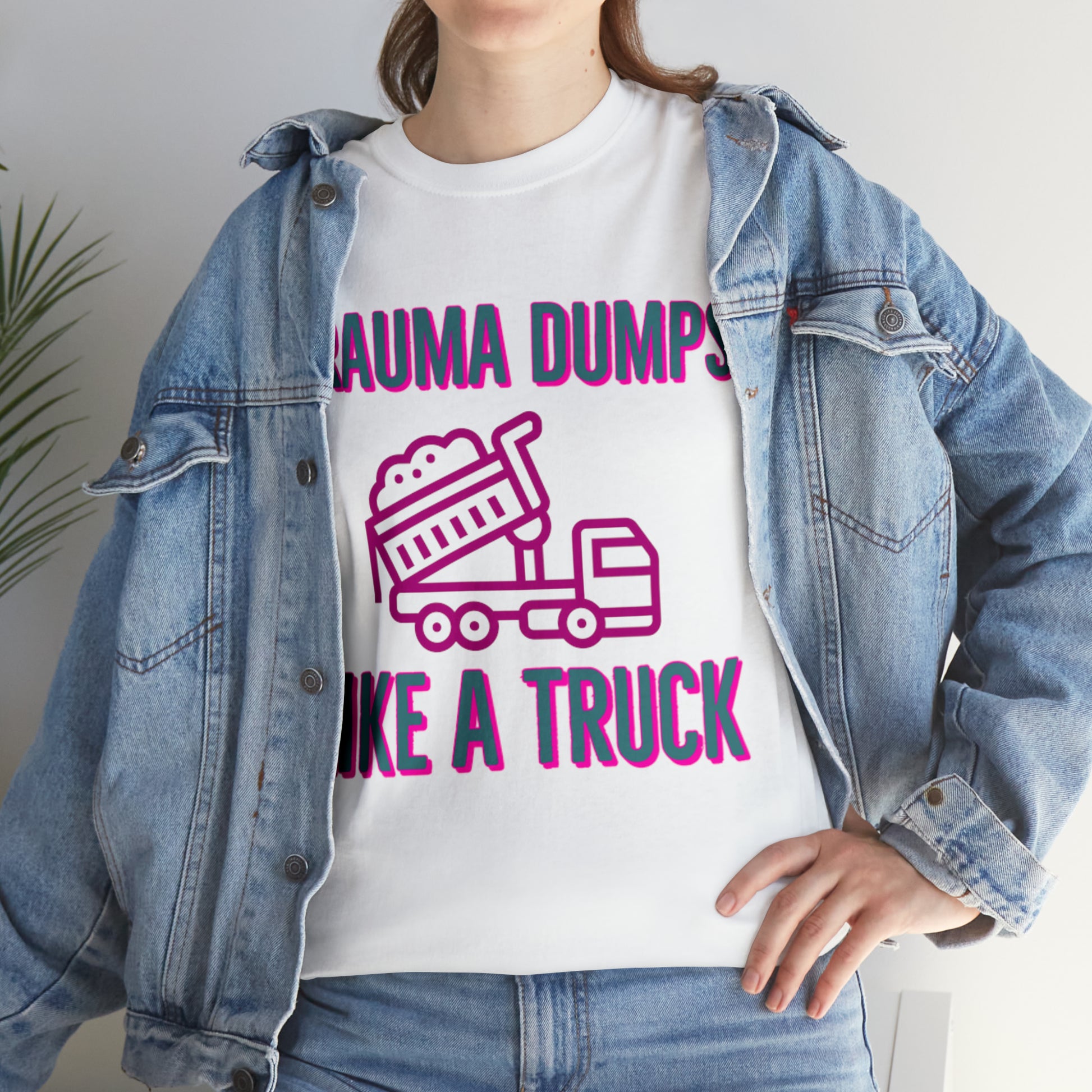 The Trauma Dump Tee features an eye-catching design showcasing a dump truck alongside the empowering words, "Trauma Dumps Like A Truck." This bold statement serves as a reminder that discussing and releasing our emotional burdens is a vital part of the healing process. By wearing this tee, you become an advocate for mental health, encouraging open dialogue and fostering a supportive environment.