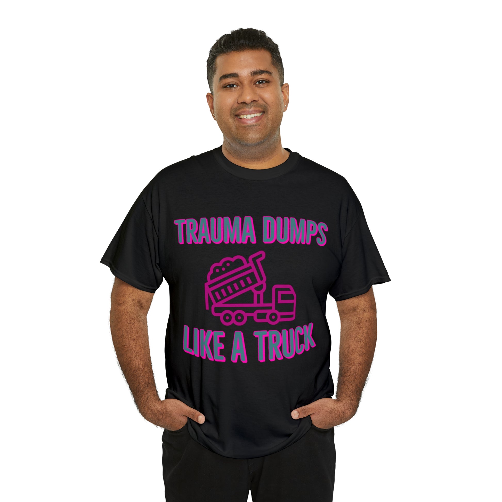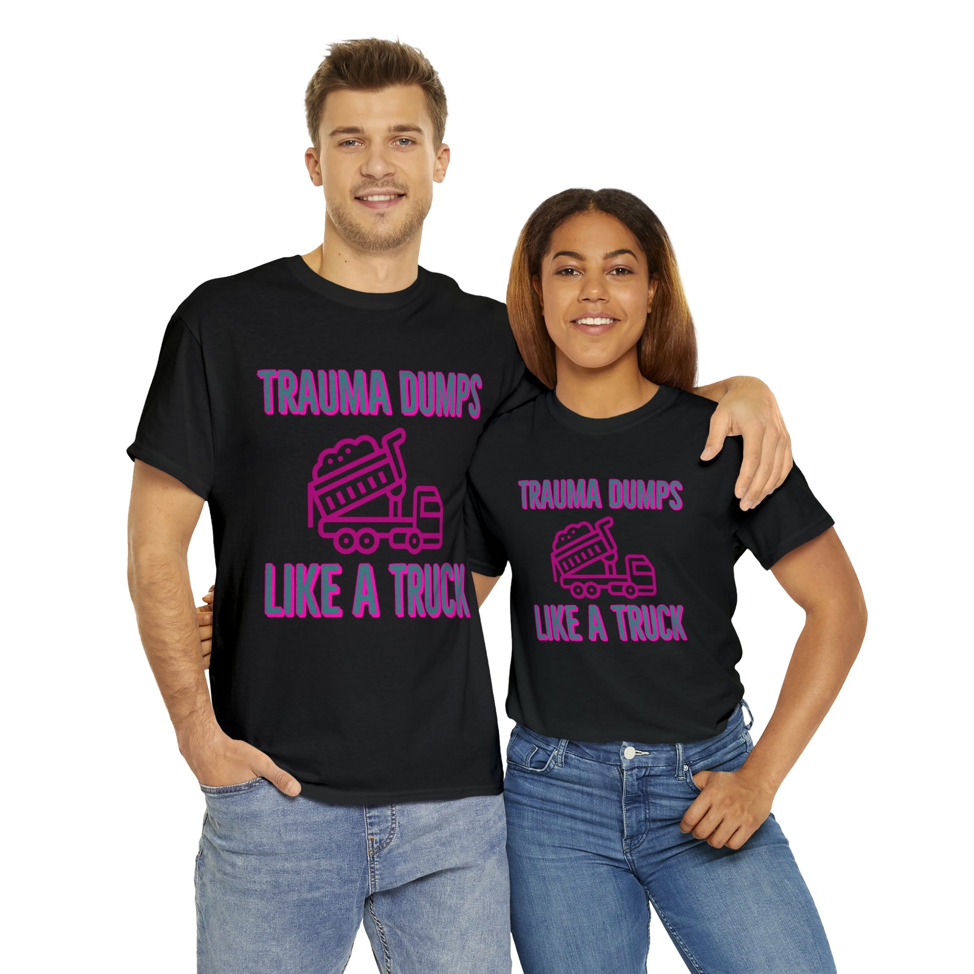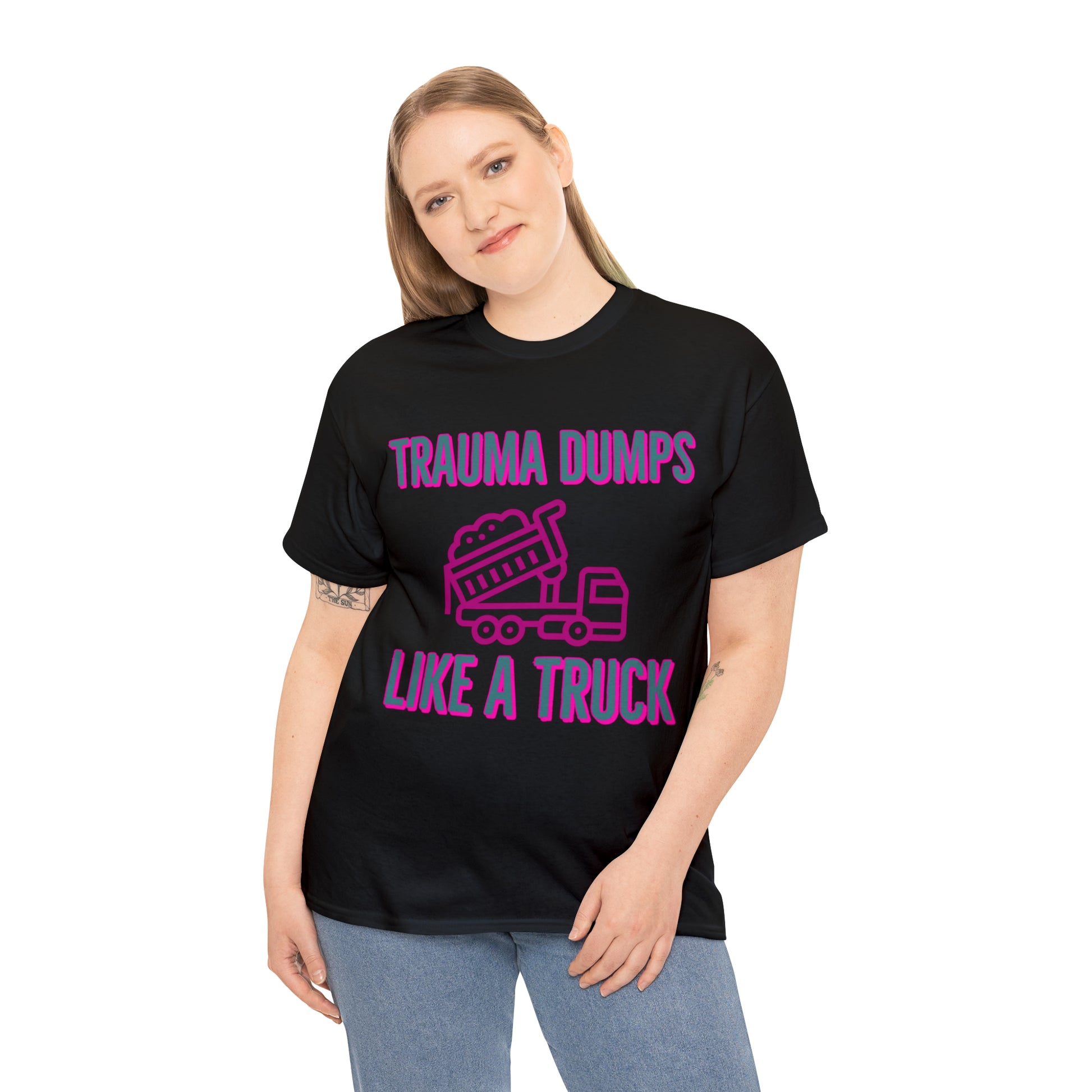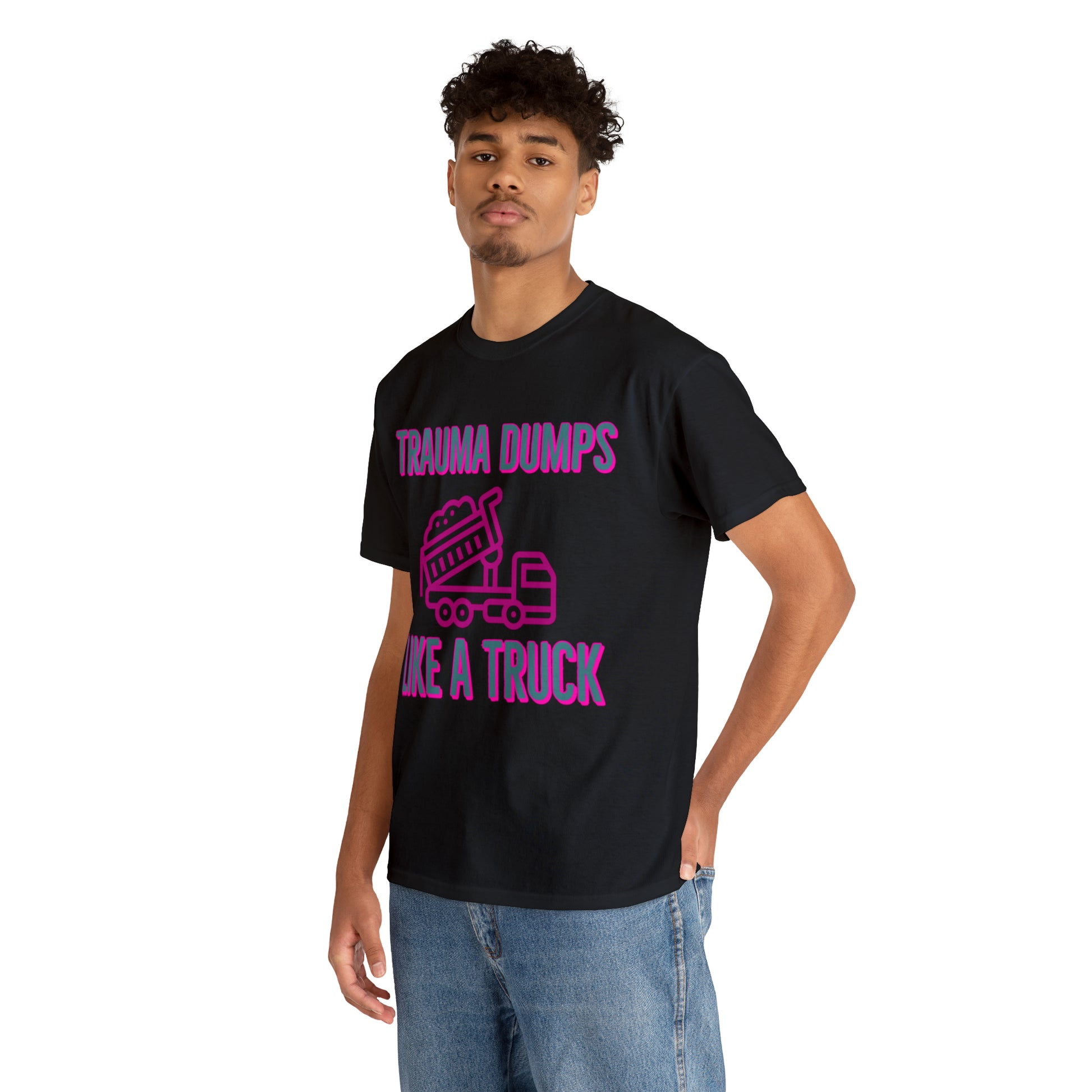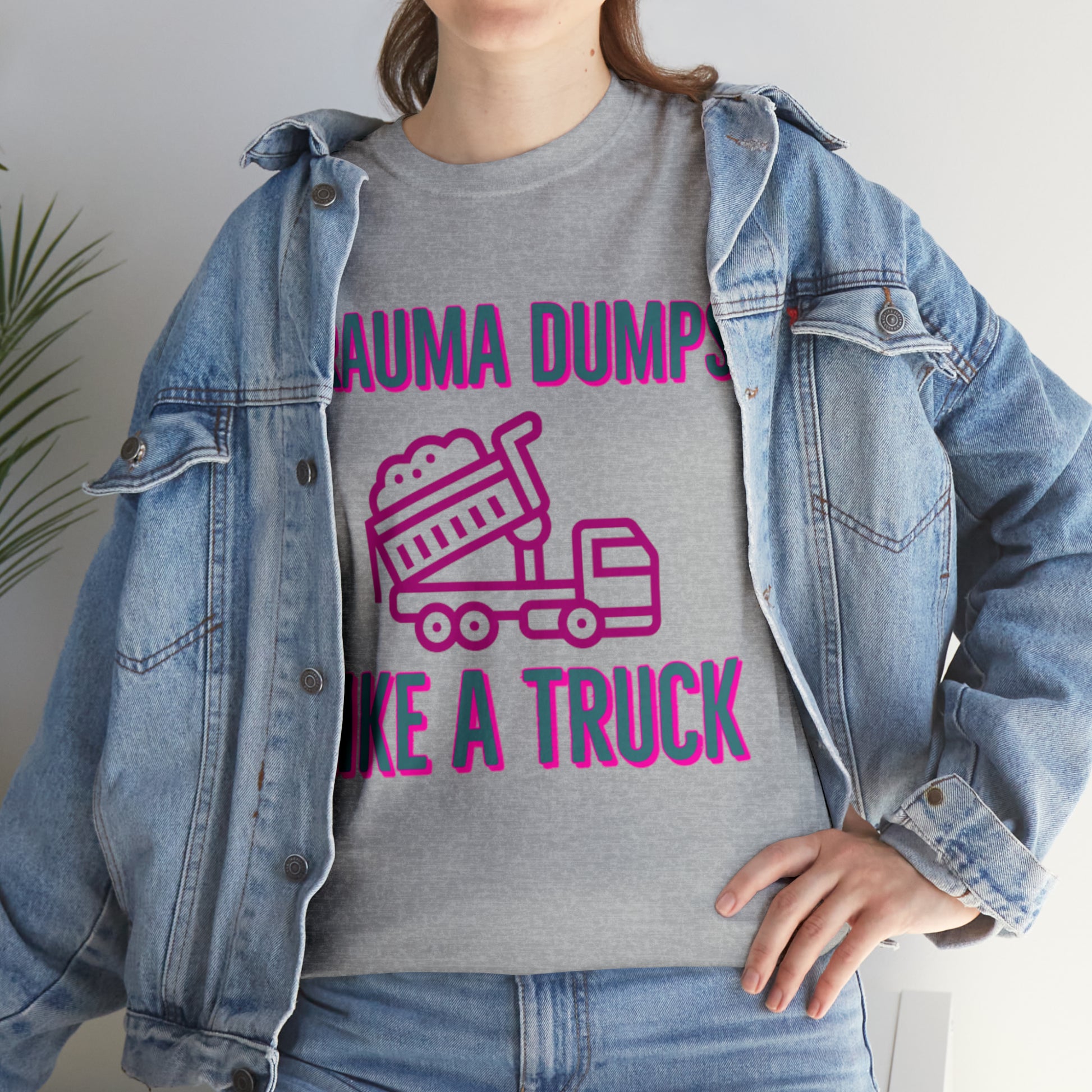 The Trauma Dump Tee features an eye-catching design showcasing a dump truck alongside the empowering words, "Trauma Dumps Like A Truck." This bold statement serves as a reminder that discussing and releasing our emotional burdens is a vital part of the healing process. By wearing this tee, you become an advocate for mental health, encouraging open dialogue and fostering a supportive environment.