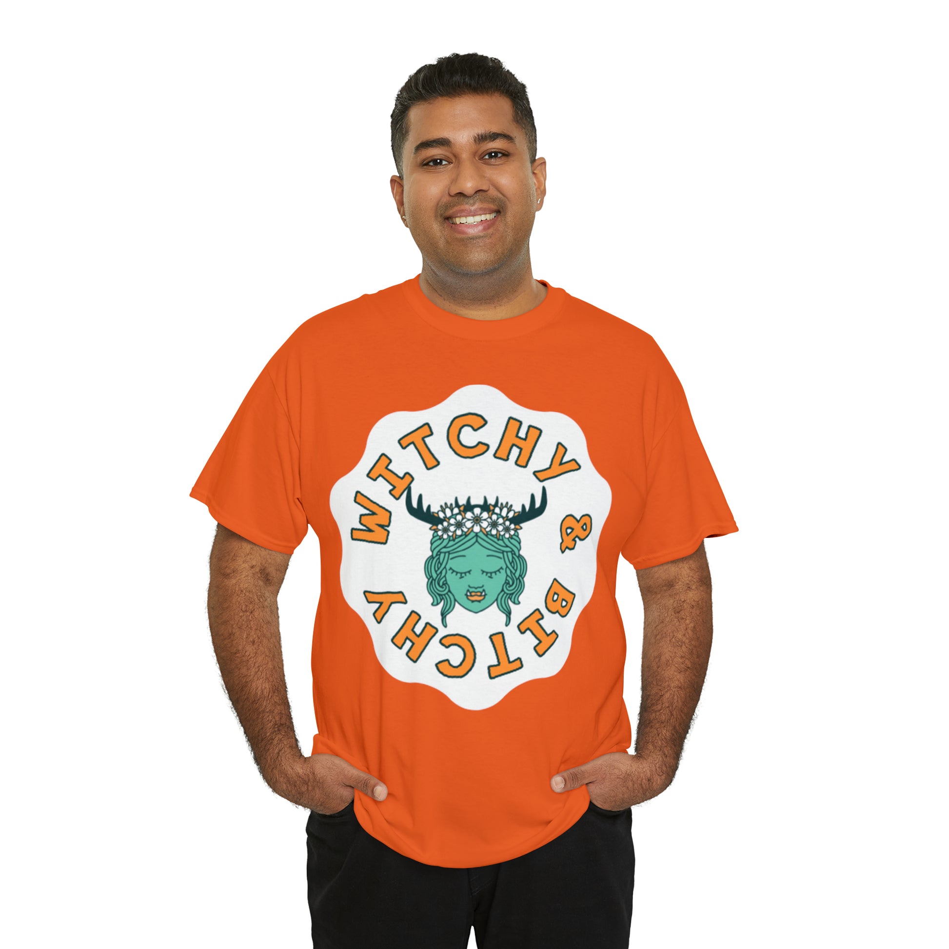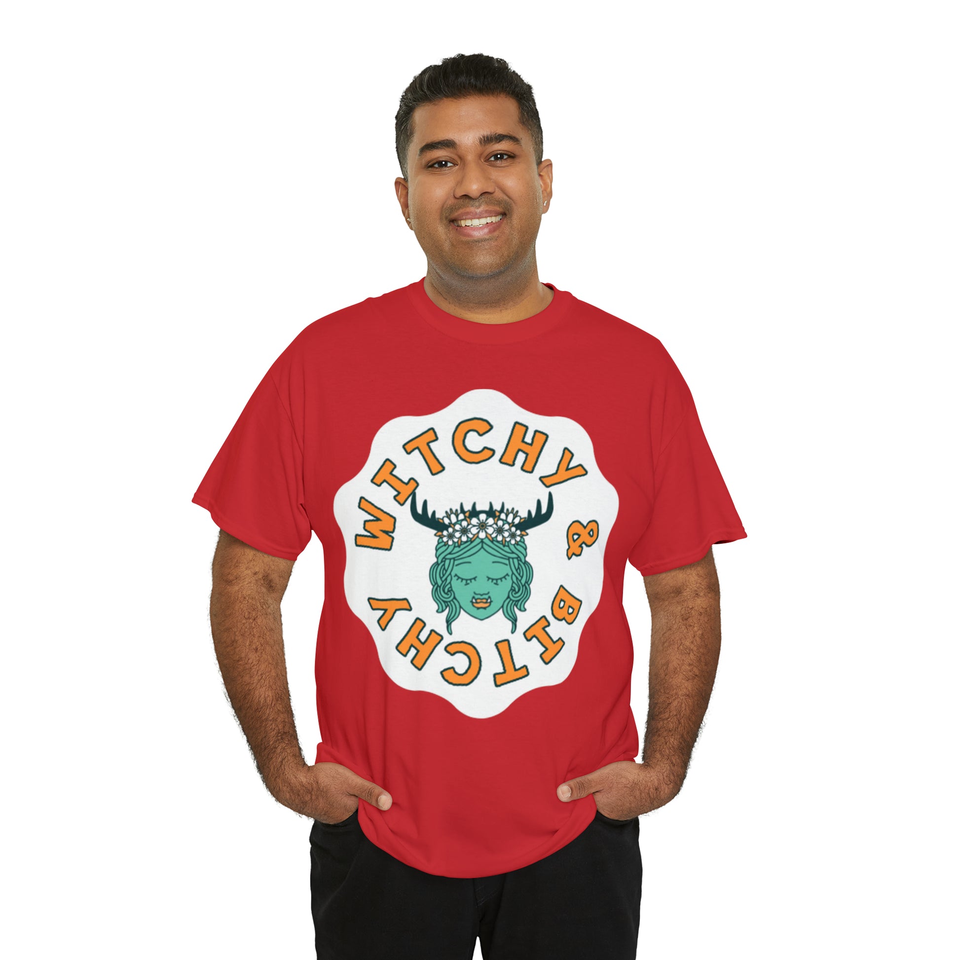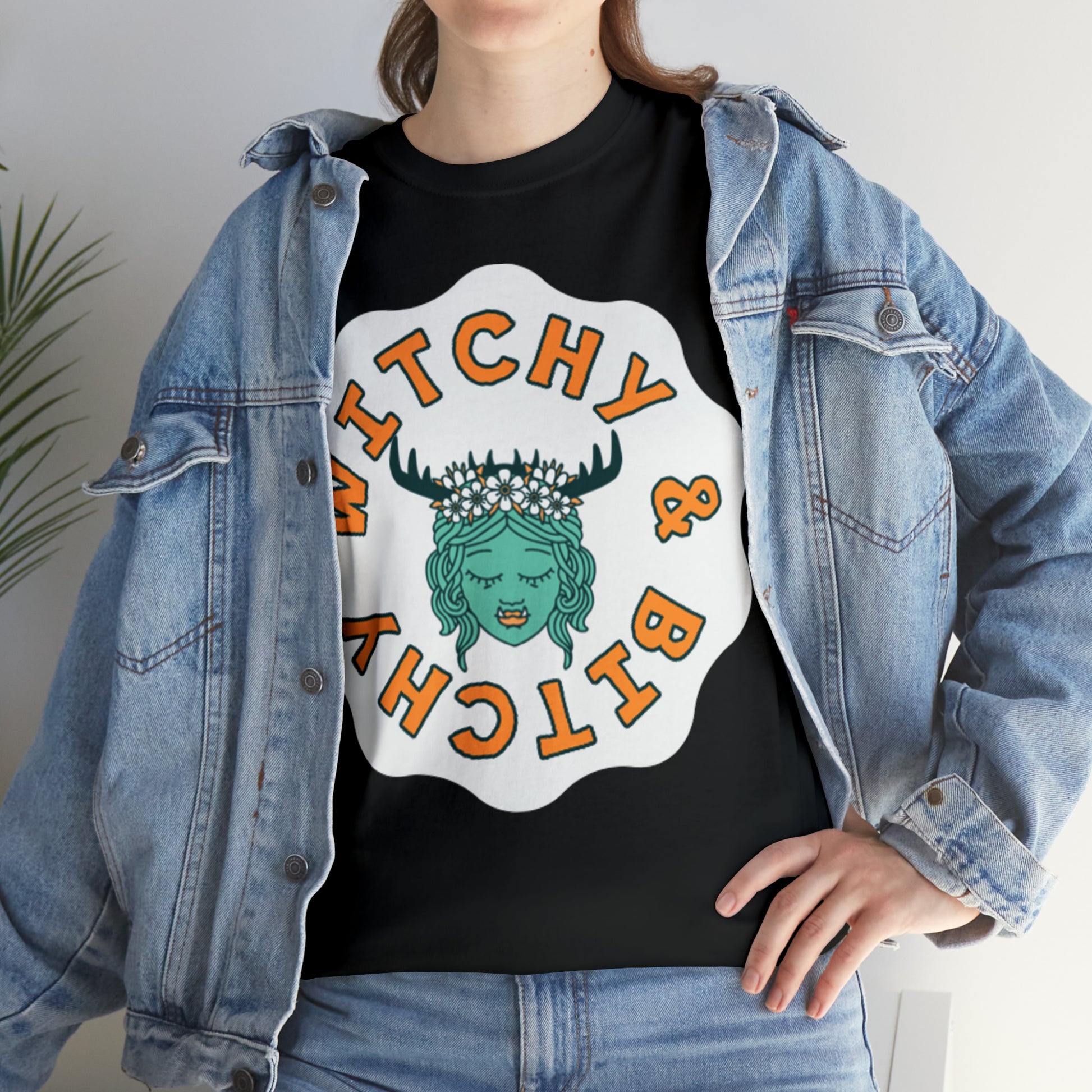 Surrounding the captivating artwork, the words "Witchy" and "Bitchy" serve as affirmations of reclaiming power and rejecting societal norms that confine and restrict. This tee is a bold statement that encourages you to embrace your uniqueness, honor your individuality, and stand confidently in your own truth.