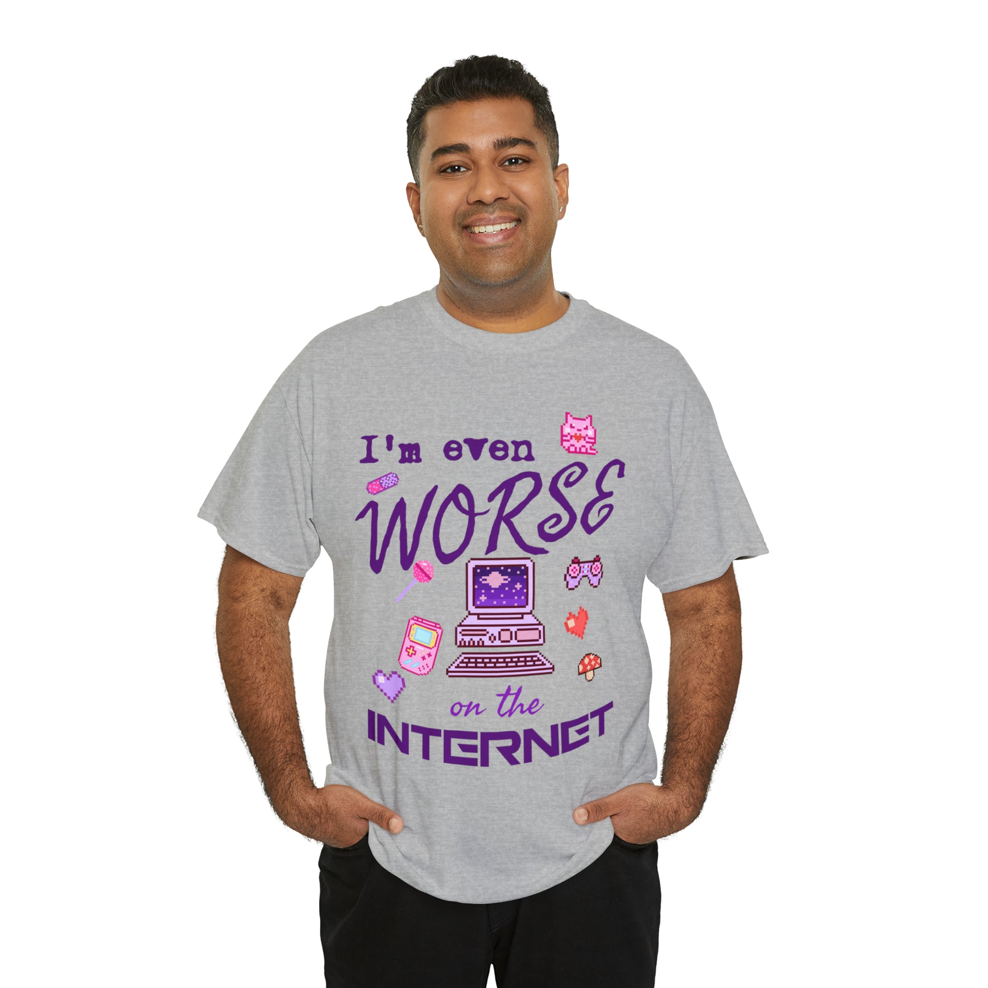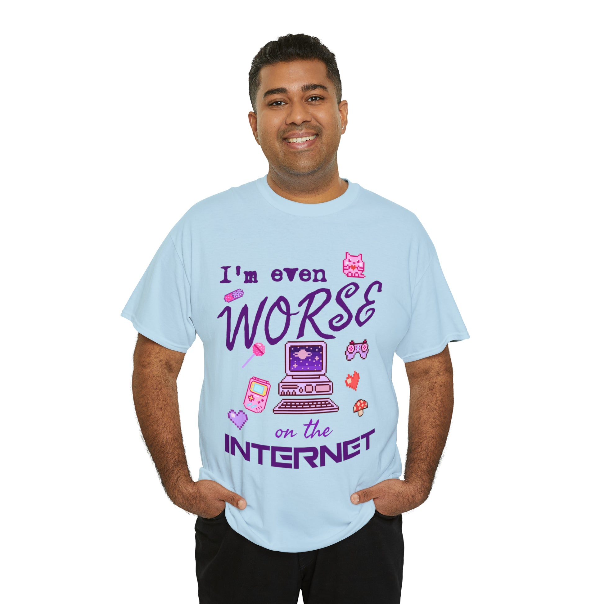 🌐 **Internet Confessions**: The tee playfully declares, "I'm even worse on the internet," capturing that unique blend of mischief and humor that's so relatable in our digital age.